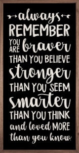 The Remember You Are Braver Sign gives us a wonderful glimpse into the wisdom that was ever-present in some of our favorite childhood storybooks. An encouraging, inspiring quote that is uplifting for children and adults! Hang this where everyone can see it everyday!
