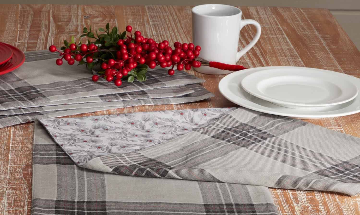 - Twilight Runner – We adore a good reversible accent and this runner gets excellent marks! Combining Dark Charcoal, soft Gray and Red tones in a striking plaid, you’ll see why we think this runner is a great choice for your updated Christmas decorating. Flip it over for a softer, gentler look with a white background covered in flowers and leaves featuring dusty grays and charcoal tones highlighted with deep red flower centers. Both fabrics mirror the popular neutral tones of contemporary interiors today.