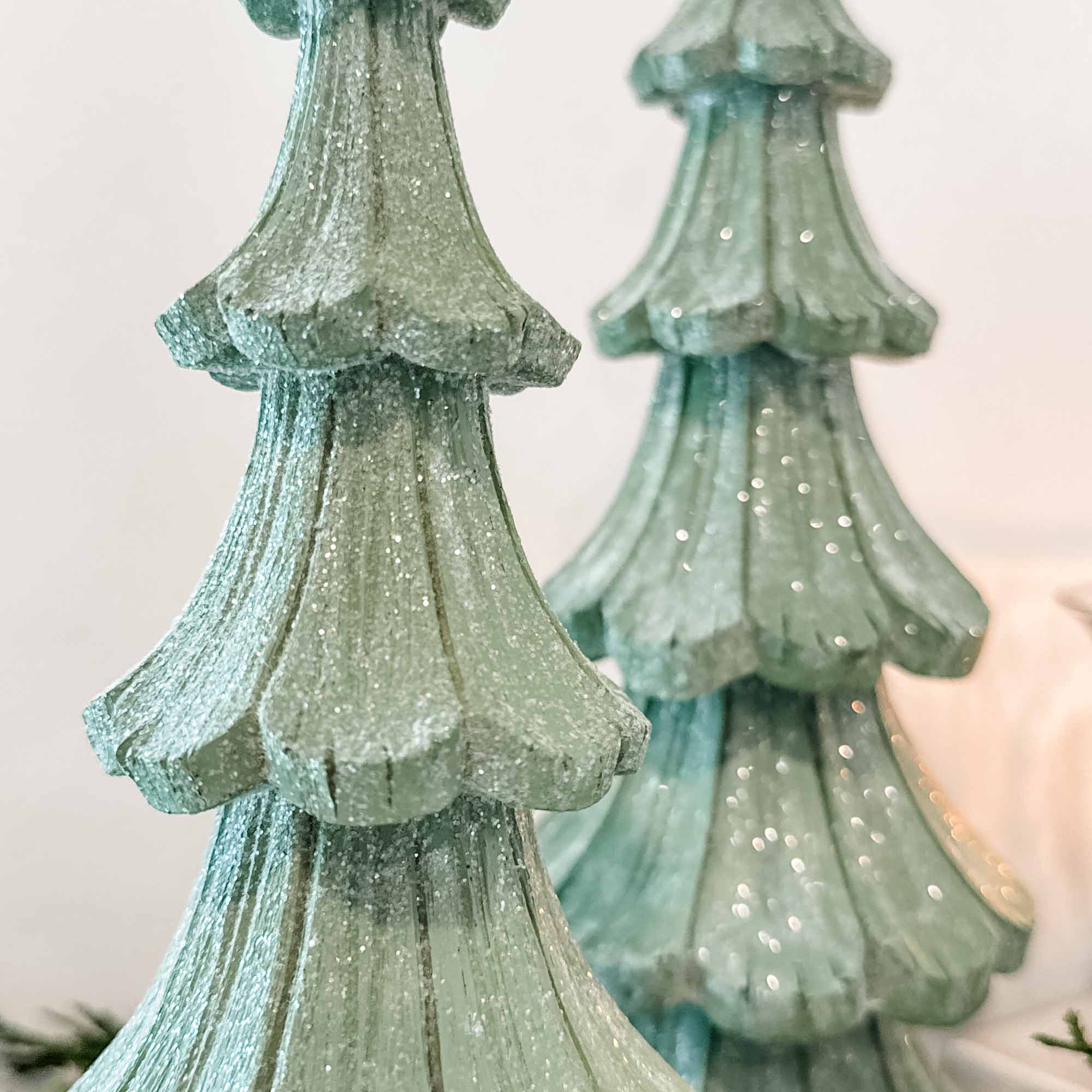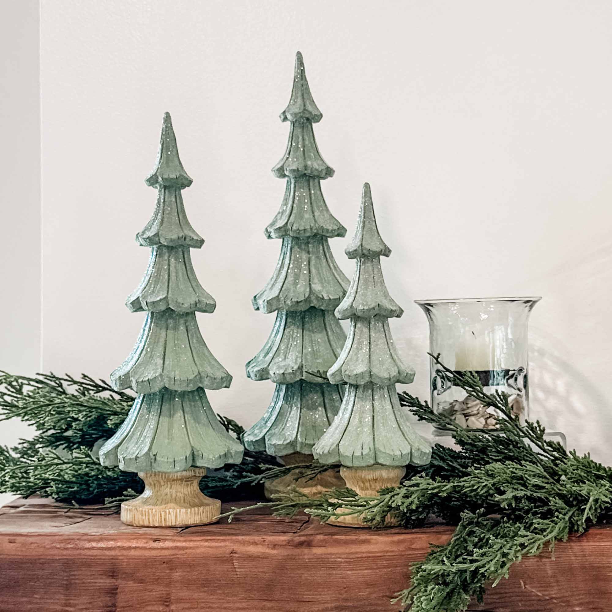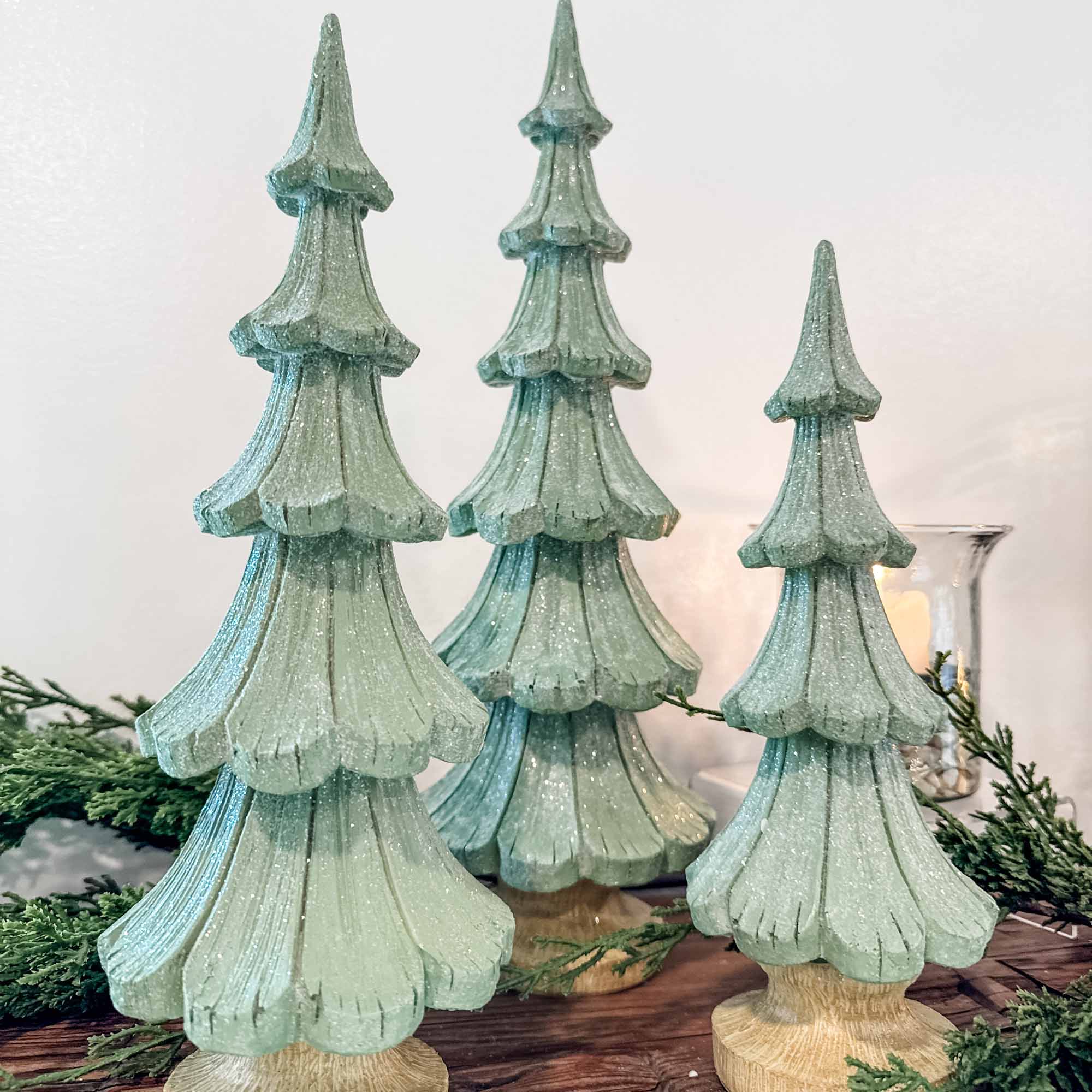 Celebrate the serene beauty of winter with the Nordic Noel Trees, a trio of festive pine silhouettes that blend rustic charm with modern elegance. Crafted in earthy green tones with delicate glittered accents, each tree features a stylized shape and subtle faux wood grain etching, evoking the look of hand-carved decor dusted with freshly fallen snow. Their shimmering finish catches the light just enough to bring a warm, seasonal glow to your space without overwhelming.