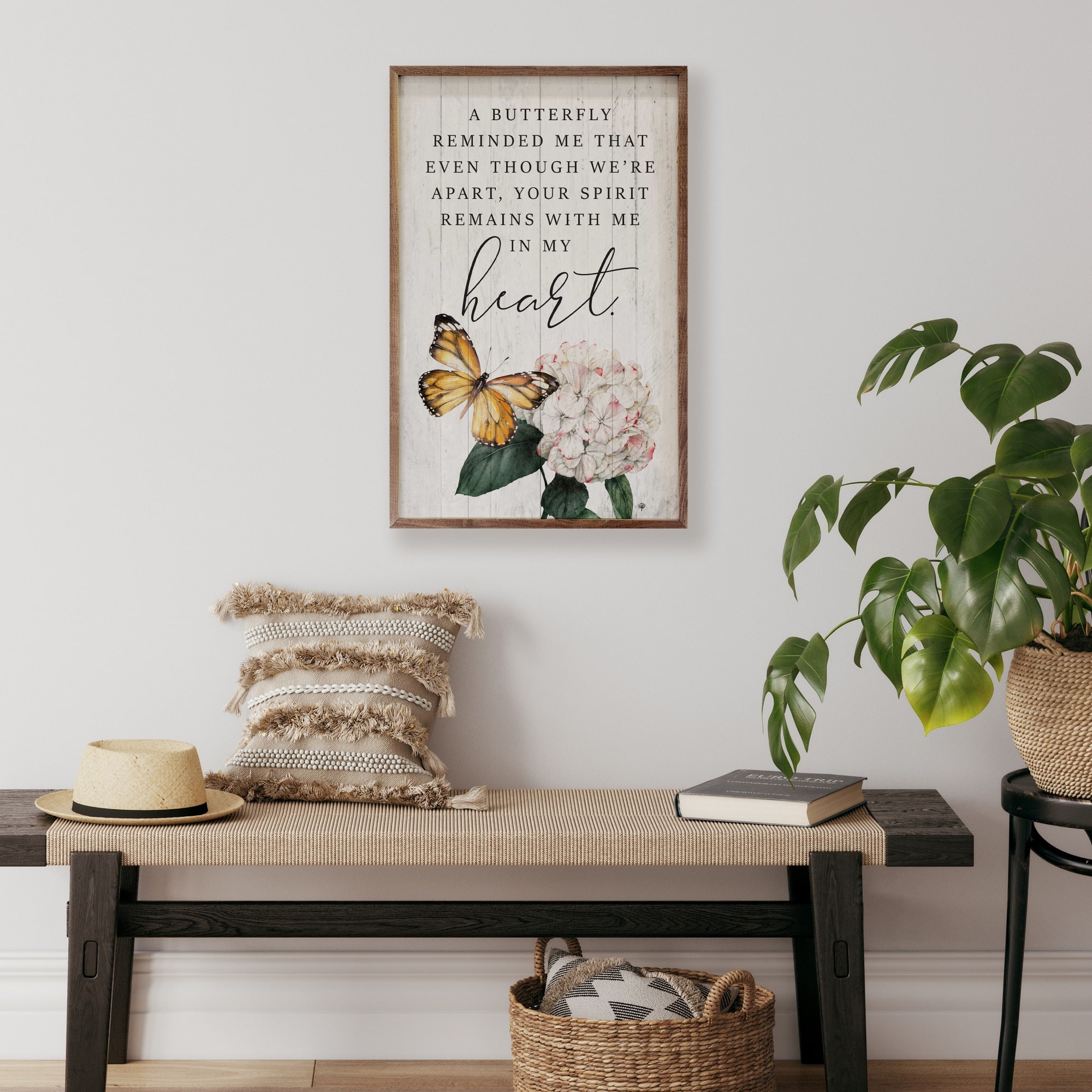 A beautiful reminder that although a dear, loved soul may no longer be here in their physical form, their spirit remains with you for all the days of your life. An elegant design with a butterfly and hydrangea bloom, this delightful sign will accent any space perfectly, bringing an uplifting message that encourages you on those difficult days. Hydrangea petals in soft white tones, touched with pink accents, deep green leaves and a monarch butterfly bring a gorgeous realism to your wall or bookshelf that never fades or flutters off. The words are truly the star of the sign, reminding you that “Even though we’re apart, your spirit remains with me in my heart.” What a beautiful reminder!! The simple style of the frame completes the look with a natural, understated simplicity. Signs are made to order.