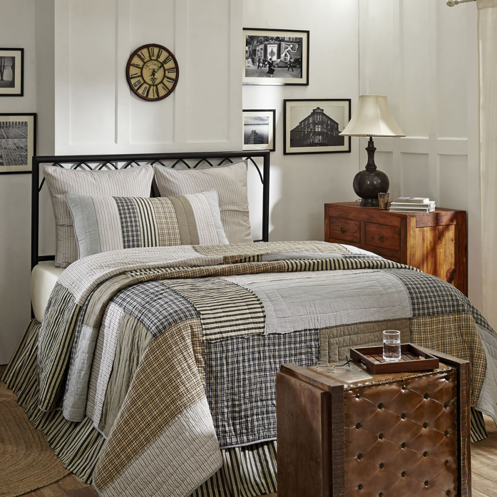 The vintage, casual appearance of the Ashmont Quilt updates your bedroom in a relaxed, farmhouse style. Hand-quilted and using a color palette of grey, white, tan, brown, and various blues, this all-cotton quilt melds the old and new into an innovative patchwork look of ticking stripes and plaids. The reversed seams give our lightweight quilt a casual, well-worn feel while adding dimension and texture to your overall decor. Uneven, patchwork-style blocks and reverse stitching on the front is reminiscent of vintage rag quilts adding extra dimension and texture to the overall look. Our Ashmont Quilts are made of 100% cotton shell and batting. Reversing to a charcoal and creme ticking stripe, this timeless quilted bedspread provides heirloom quality that will be a favorite for years to come.