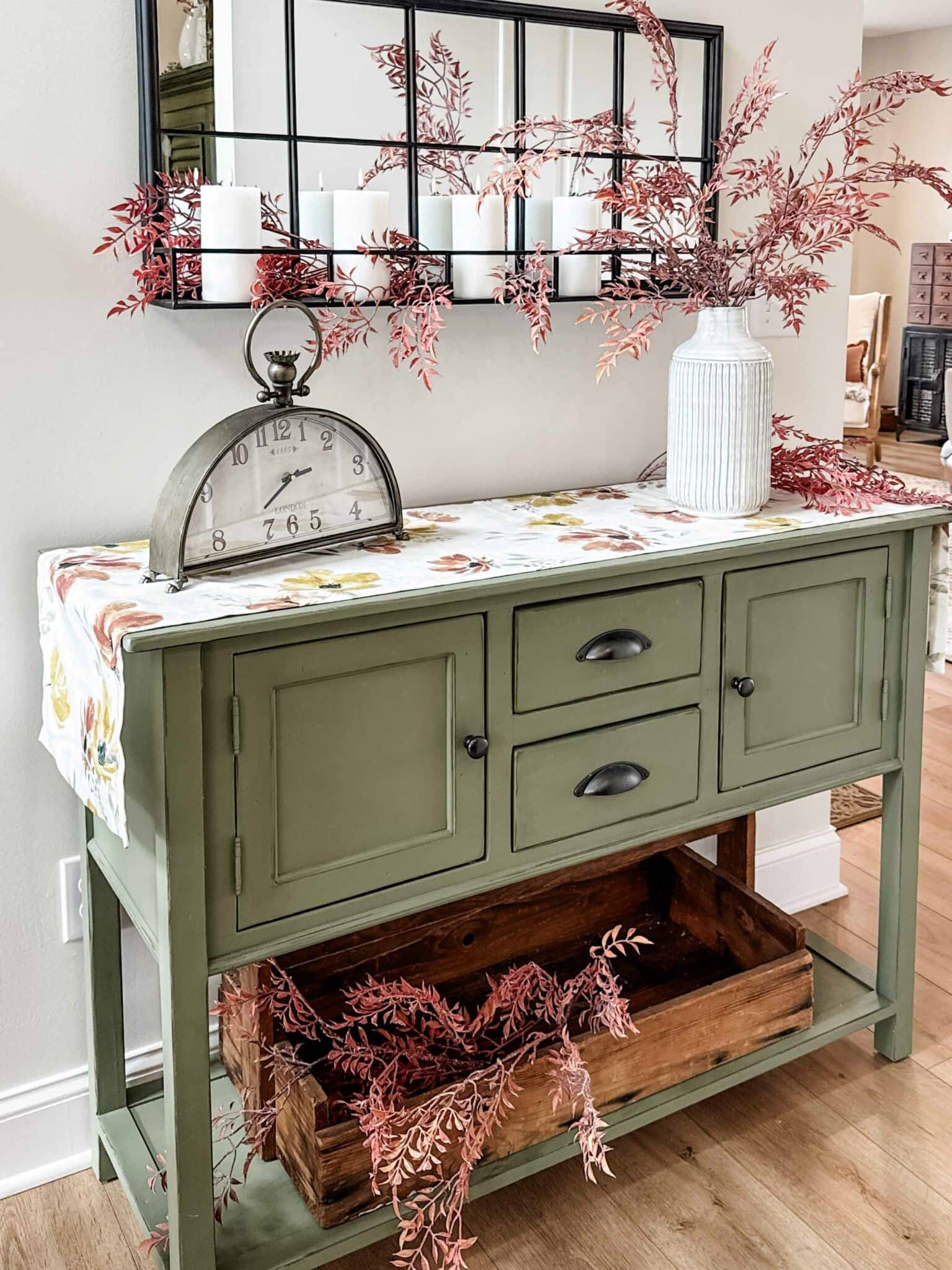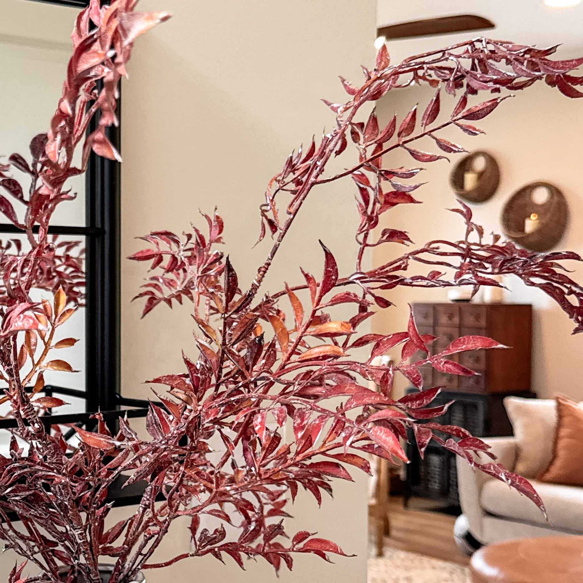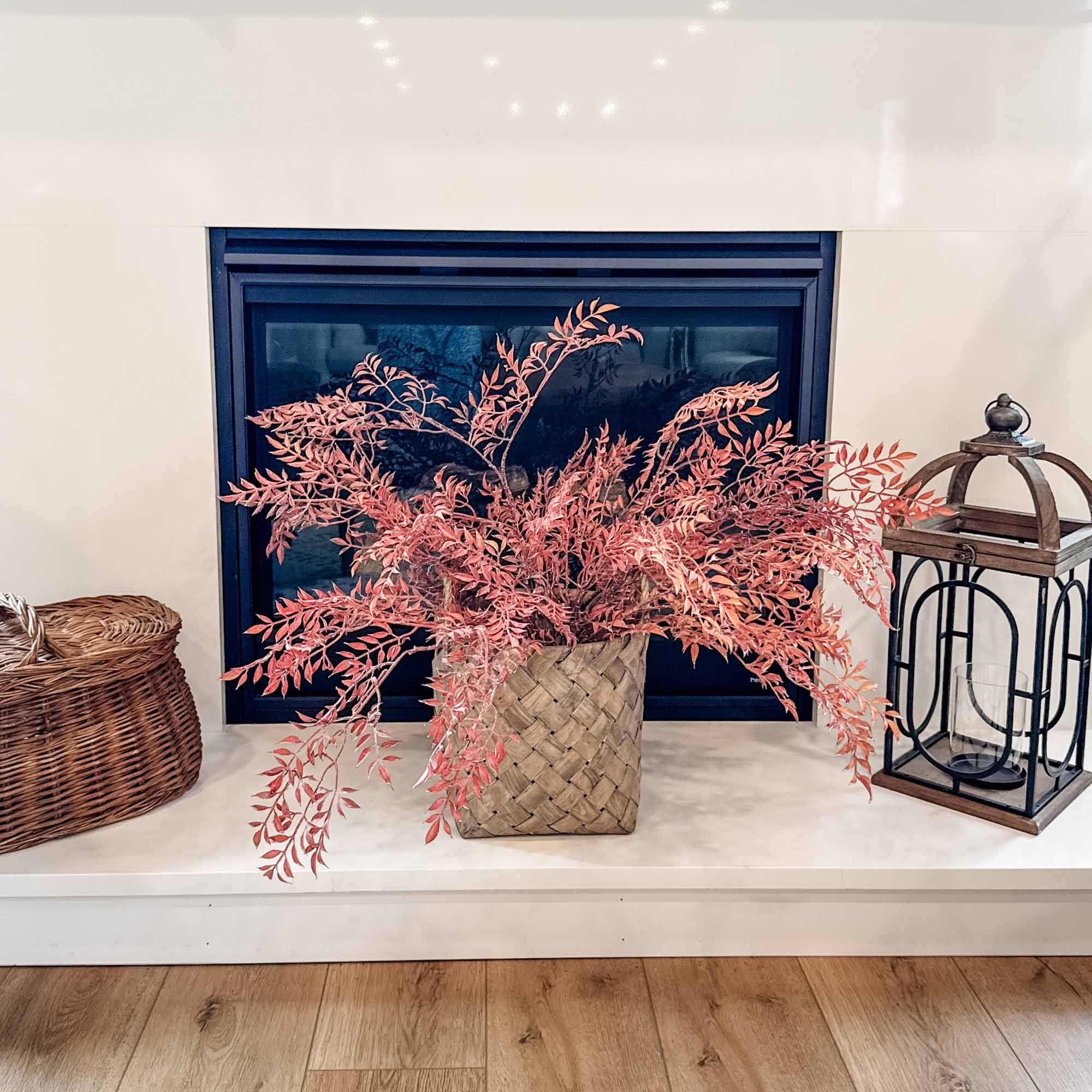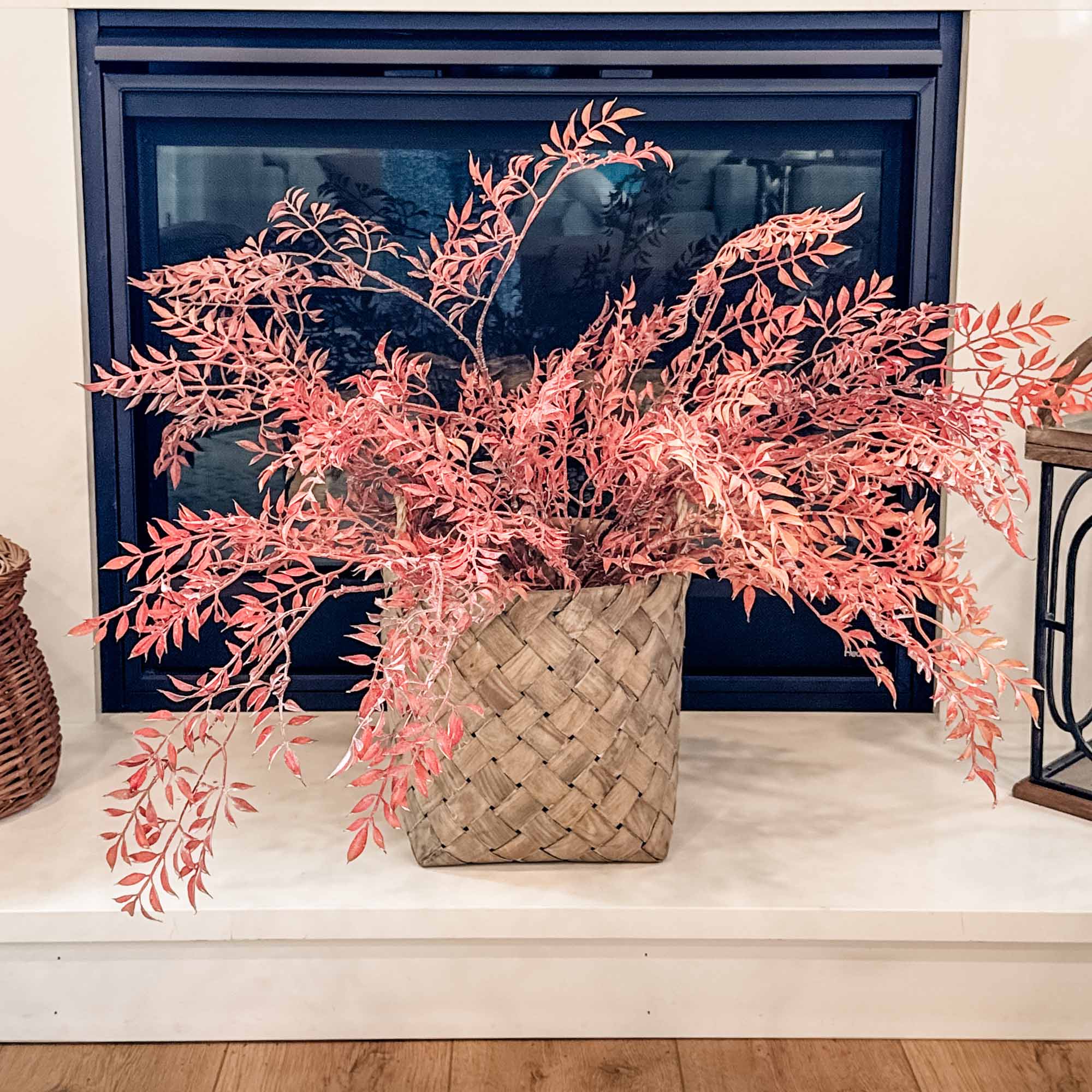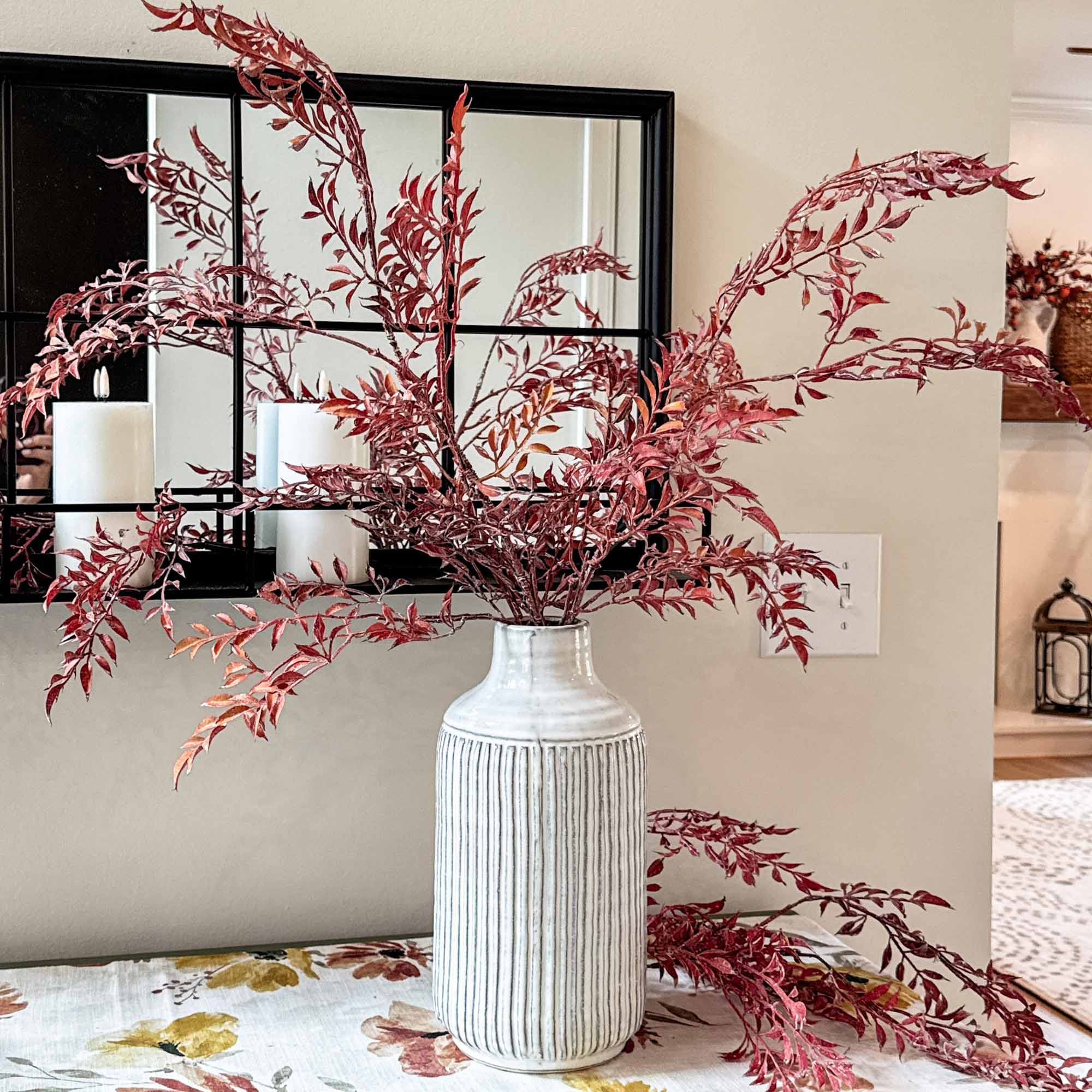 Bring the vibrant beauty of fall indoors and infuse your home with the rich colors and cozy feel of autumn with the Autumn Leaf Spray Set. This set of six matching sprays showcases bold red tones and a charming mini leaf design that captures the essence of the season. Each spray features wired stems and branches, offering flexibility and support for effortless styling in vases, wreaths, garlands, or centerpieces. Whether you’re creating a festive fall arrangement or simply adding a touch of seasonal warmth to your space, these sprays deliver striking color and natural texture wherever they’re placed. We put 2 stems in the white vase and one tucked into the mirror shelf. We then tucked one next to the white vase and the last 2 in the box under the cabinet! So many options! We also thought it was nice to put all 6 into one basket and place the basket in front of the fireplace. The ideas are endless.