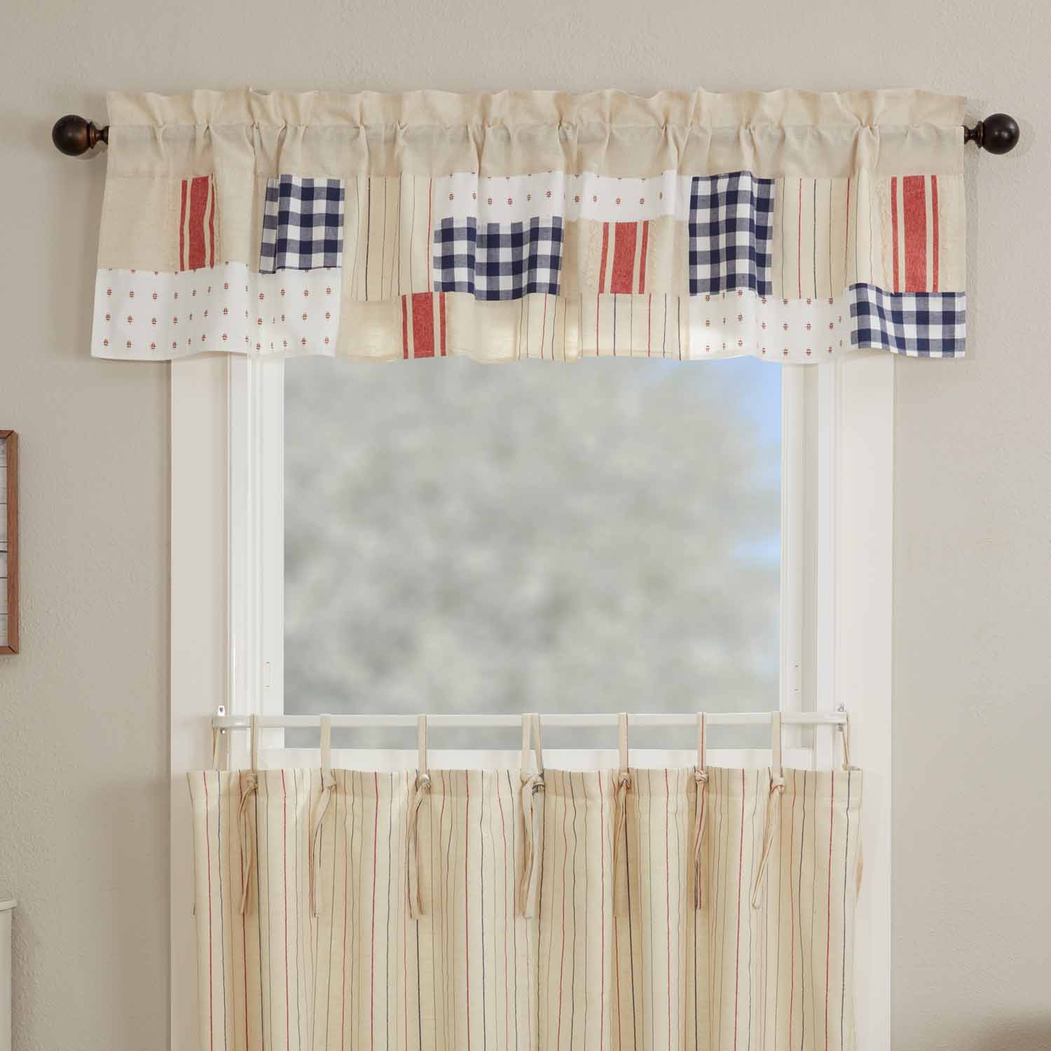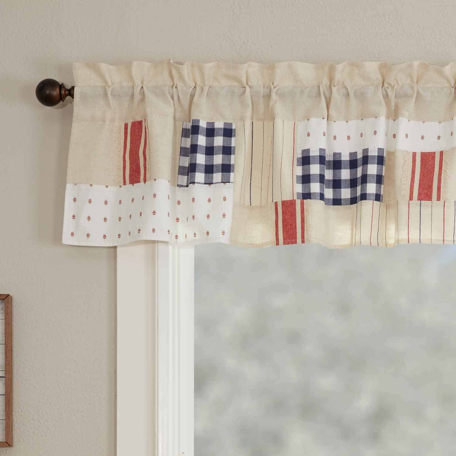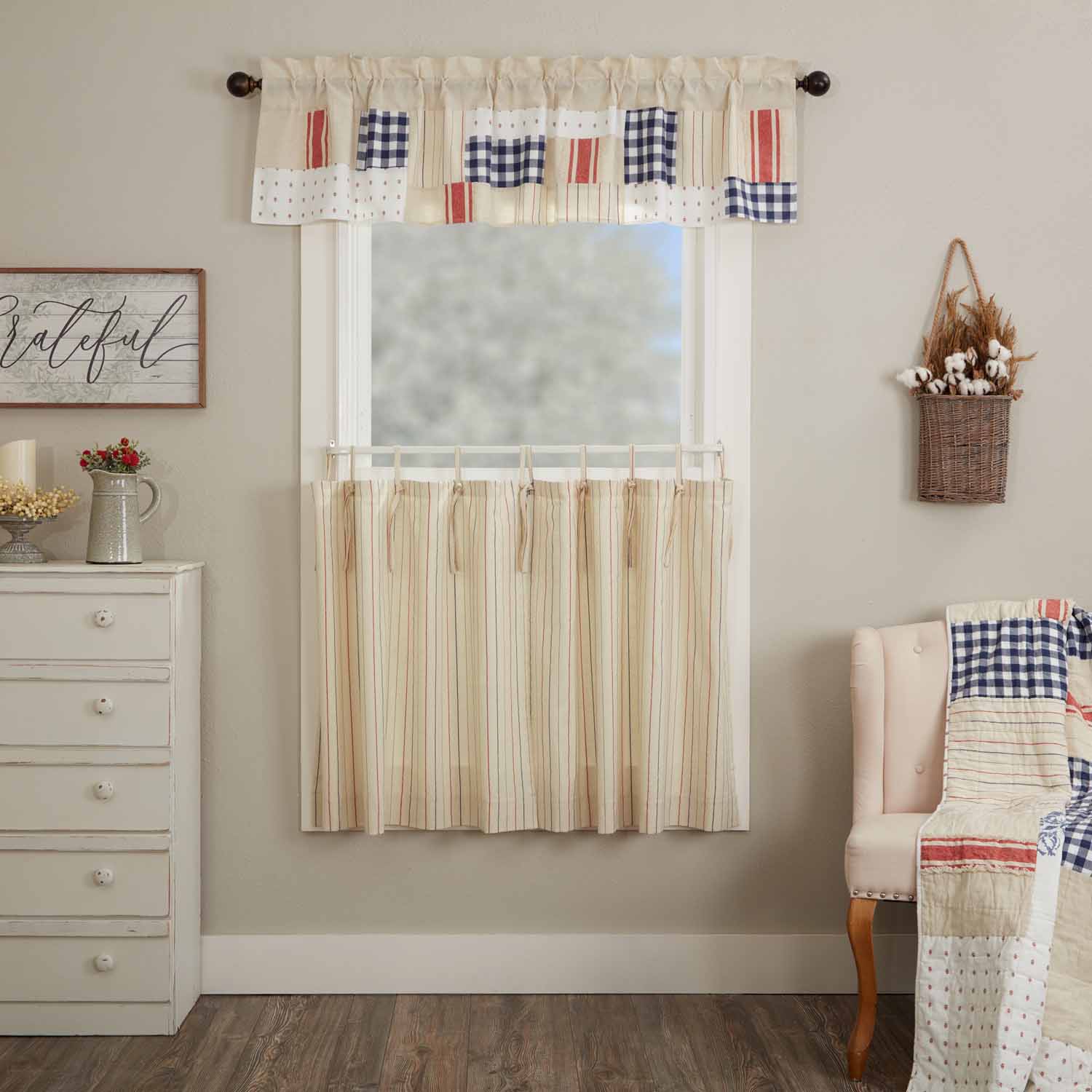 Cozy up your farmhouse windows with the distinct homespun style and dynamic patchwork of the Betsy Collection. The stand-out colors of red, white, and blue echo a love of flag and country displayed with a uniquely innovative flair in the grand Americana quilting tradition. Four distinct fabrics in the design include large bold stripes, symmetrical gingham, thin chalk stripes, and a scaled-down cross and dash design.