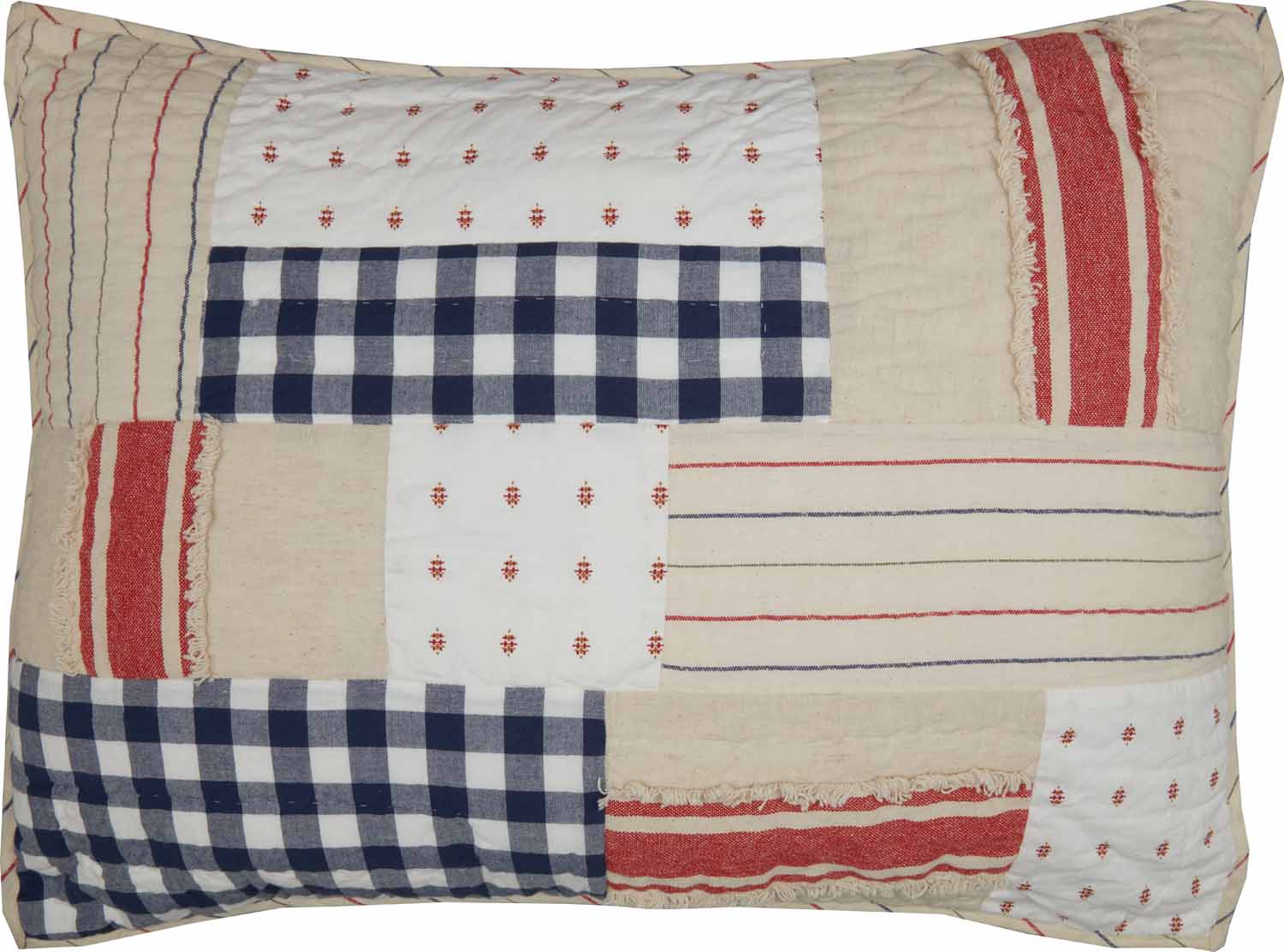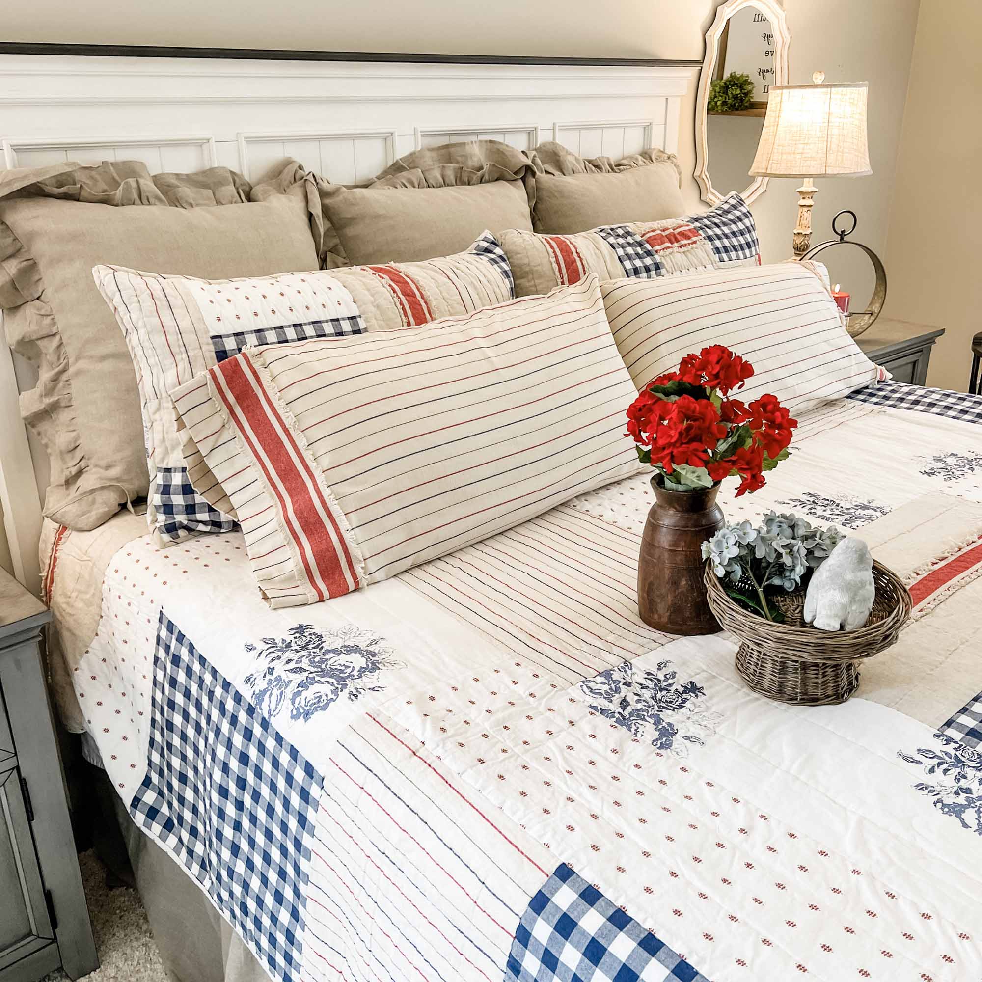 Cozy up your farmhouse bedroom with the distinct homespun style and dynamic patchwork of the Betsy Collection. The stand-out colors of red, white, and blue echo a love of flag and country displayed in a unique and innovative design in the grand Americana quilting tradition. There are five distinct fabrics in the design including large bold stripes, symmetrical gingham, thin chalk stripes, a scaled-down dash and cross design. The cover reverses to a gorgeous cabbage rose pattern. The designs complement each other beautifully in a luxurious, plush sham that brings vitality and visual energy to your bedding ensemble.