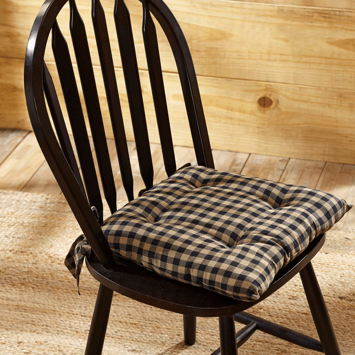 We love the way the Black Check Chair Pad adds depth of color and rich interest to a Primitive, Vintage, or Country farmhouse style. A thick and comfortable chair cushion, made with 100% cotton and cotton fabric ties, this charming accent is sure to add a noticeable visual appeal and a cozy touch to your chairs. The check fabric of black and tan is a traditional favorite in classic country designs, bringing a rustic, downhome warmth to your kitchen or dining area.