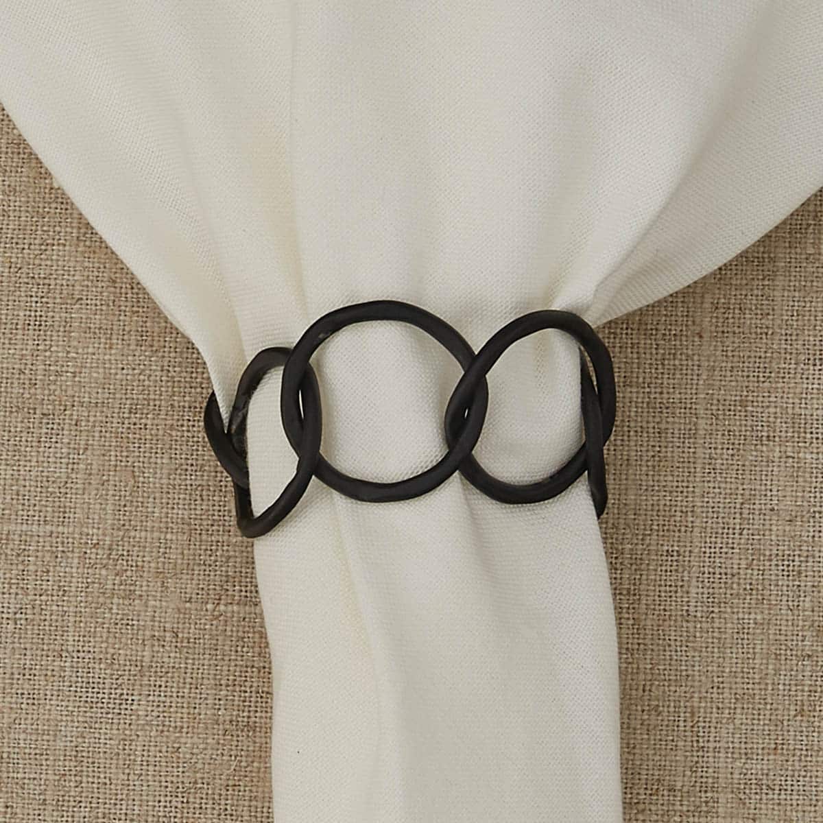 The asymmetrical circular links create a unique yet timeless look, making these napkin rings a versatile addition to any tablescape. Generously sized to accommodate standard napkins, they neatly hold your linens in place, enhancing both organization and visual appeal. Whether for casual family dinners, festive holiday gatherings, or elegant dinner parties, these napkin rings add a refined finishing touch to your setting.