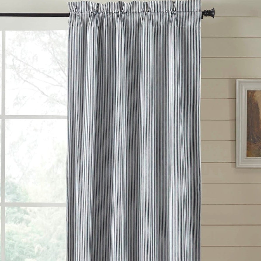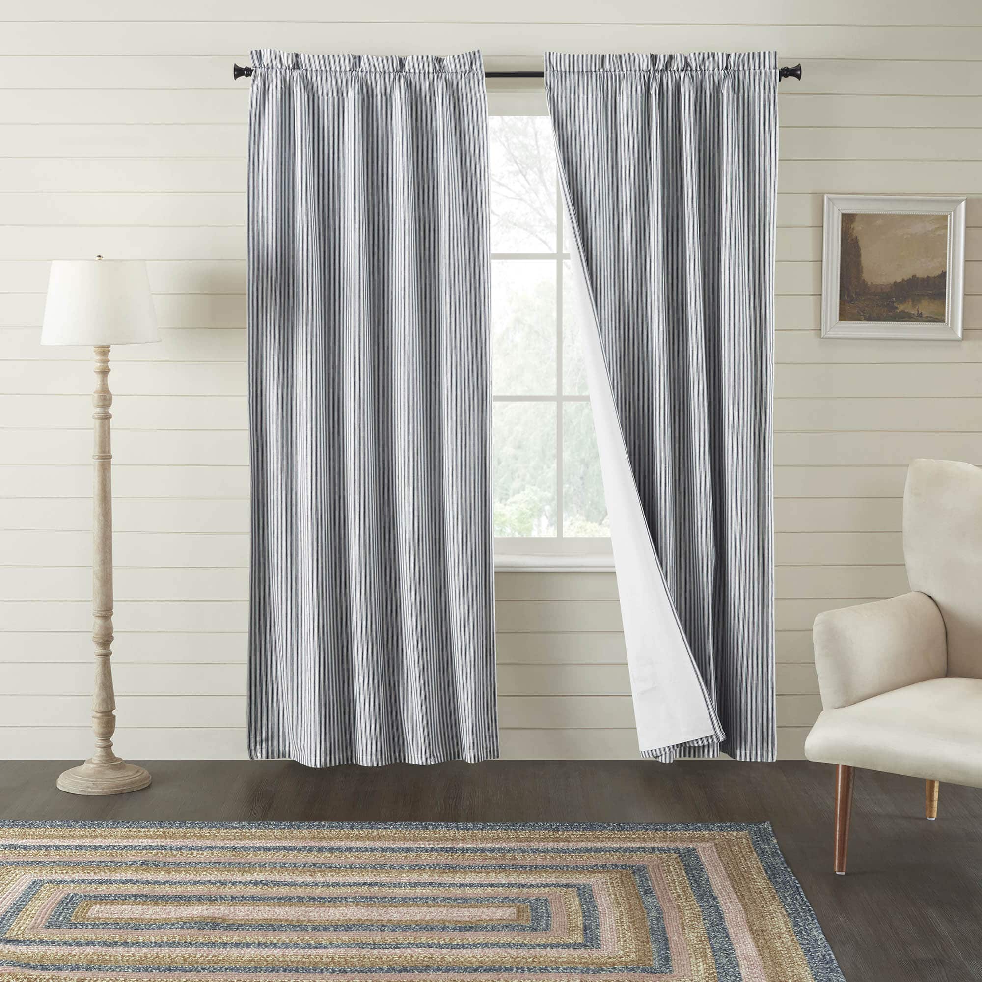 Denim blue and cream ticking stripes create the perfect accent for your vintage farmhouse window decor. The Sawyer Mill Blackout Panel includes a single 84 x 40 inch cotton window panel with a matching tie-back. The room darkening curtain includes a blackout lining crafted from 100 percent polyester to add practical benefits without sacrificing style. The blackout panel offers multiple benefits to your living space by creating more privacy and noise reduction, greater energy efficiency and, of course, the ability to control the amount of sunlight coming in. The panel will add layers of protection to shield rugs, fabrics, furniture and flooring from the sun’s rays. Sawyer Mill curtains create a comforting, darker space, which helps anyone seeking quality sleep, relaxation, or enhanced productivity. The panel is easy to hang with a generous 3.25″ rod pocket with a 2″ header.