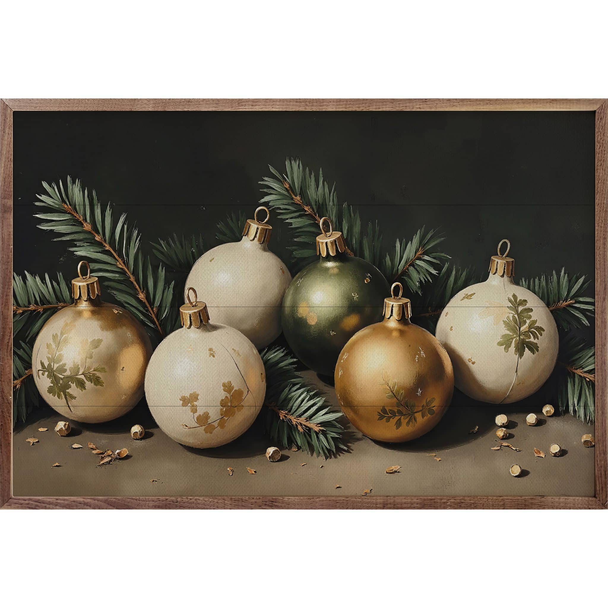 Bring timeless holiday charm to your home with the Bright Christmas Ornaments Wooden Sign. This elegant piece features a collection of shimmering ornaments in soft gold, ivory, and green hues, nestled among fresh evergreen sprigs. The rich, dark background adds depth and contrast, allowing the ornaments to glow with warmth and sophistication. Framed in natural wood, this sign captures the spirit of Christmas with understated beauty—perfect for adding a cozy, festive touch to your mantel, entryway, or dining space. Signs are made to order.