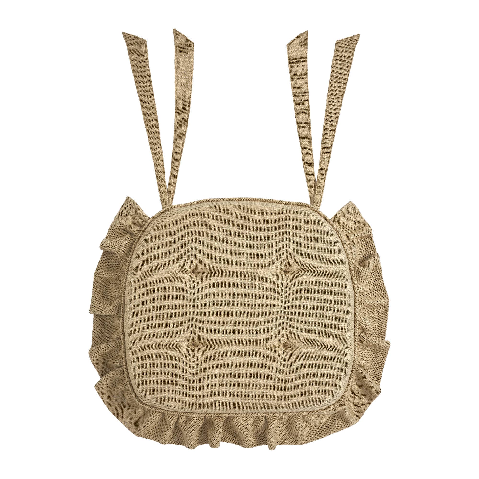Elevate your dining space with the simple charm of the Burlap Natural Ruffled Chair Pad. Featuring a classic natural hue and softly textured woven cotton, this chair pad blends effortlessly with farmhouse, rustic, and country-inspired décor. The subtle ruffled edging adds a delicate, feminine touch, while the solid burlap-style fabric offers timeless appeal and everyday versatility.