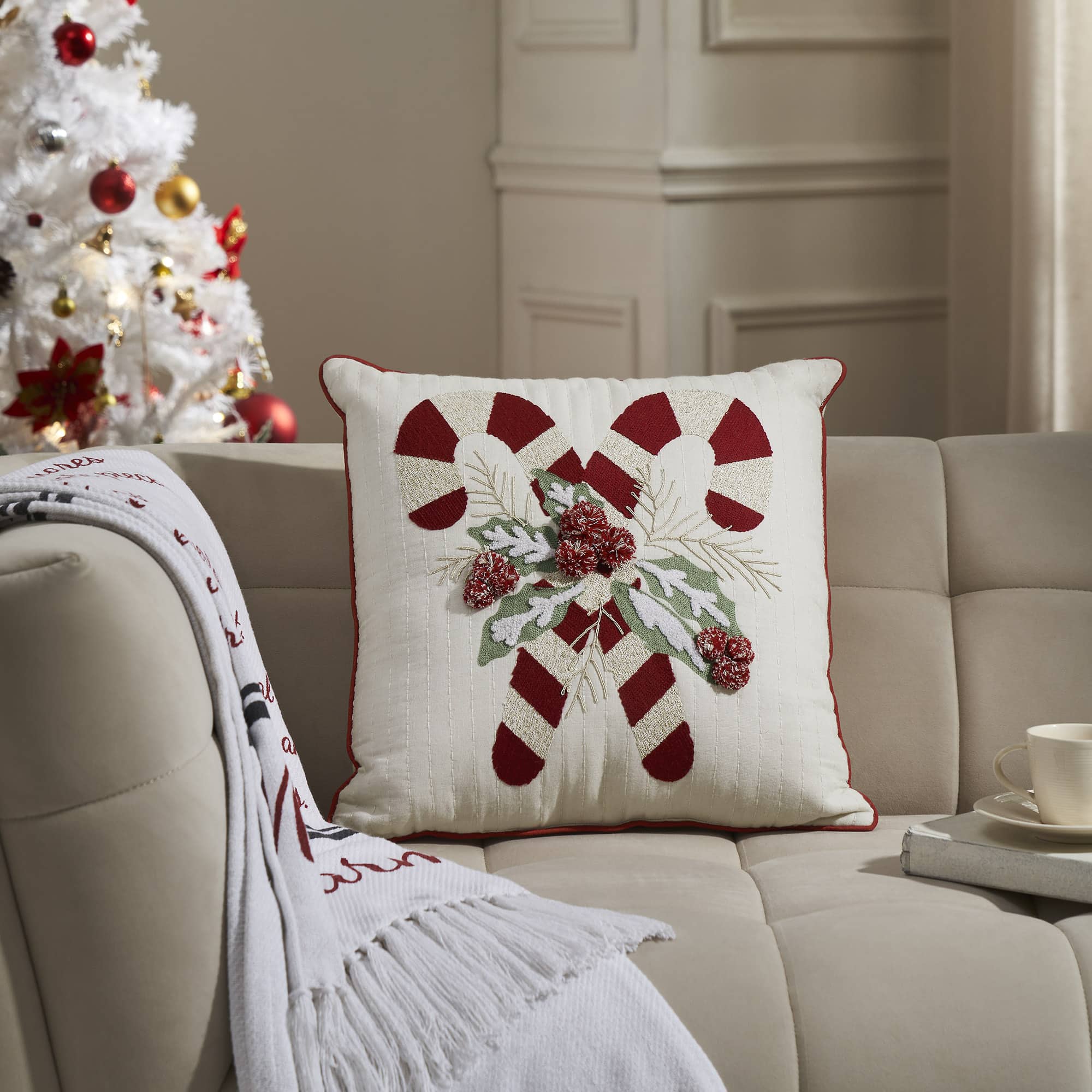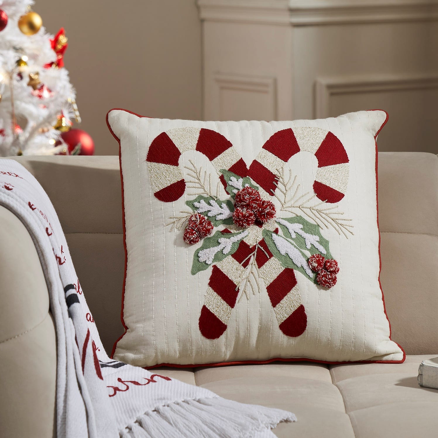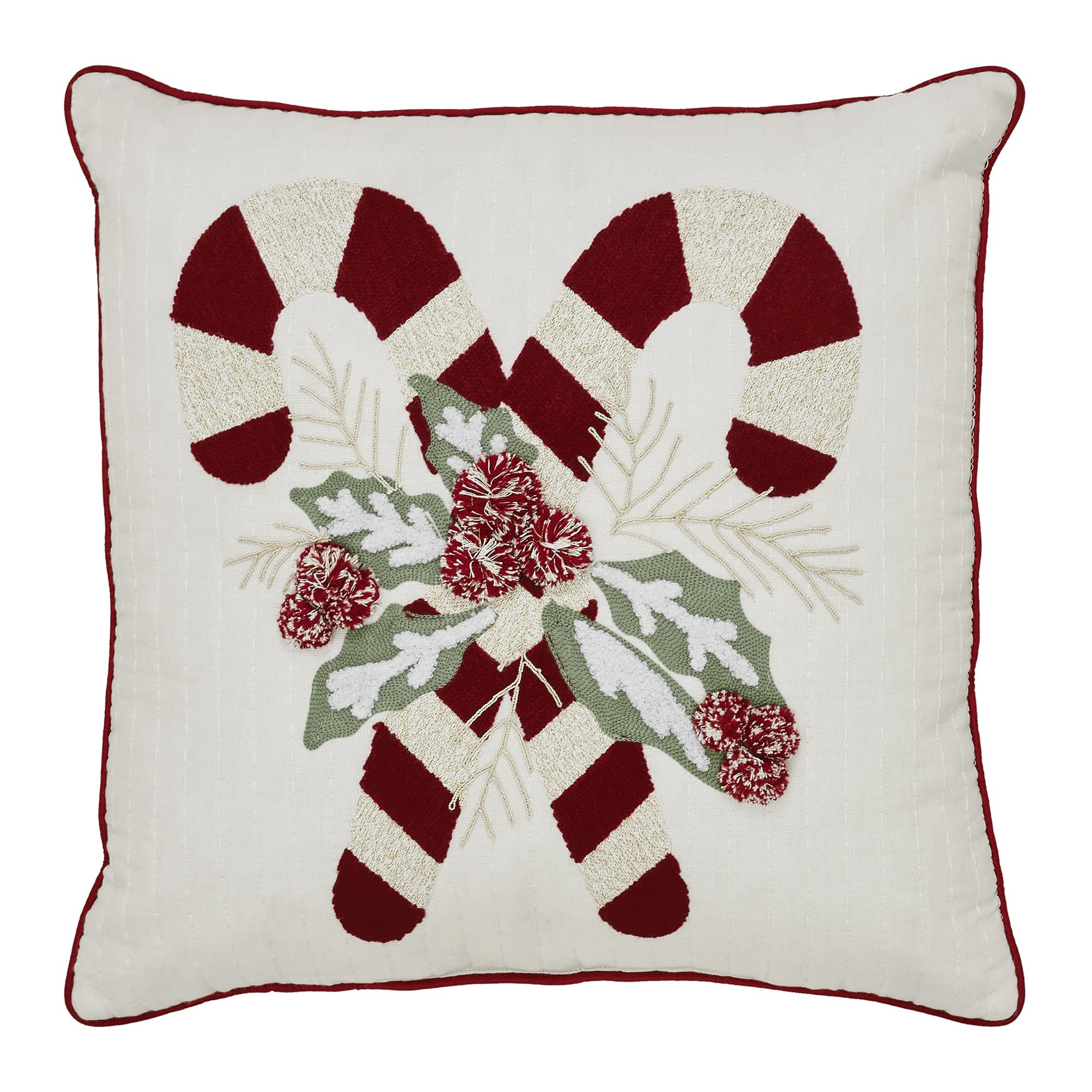Add cheerful holiday charm to your home with the Candy Cane & Holly Filled Pillow. This festive 18×18 decorative pillow captures the magic of the season with two classic red-and-white candy canes crossed at the center, accented by beautifully embroidered sage-green holly leaves and soft crème branches. Playful red-and-white pom-pom berries create a delightful 3D touch that brings texture and whimsy to your Christmas décor.