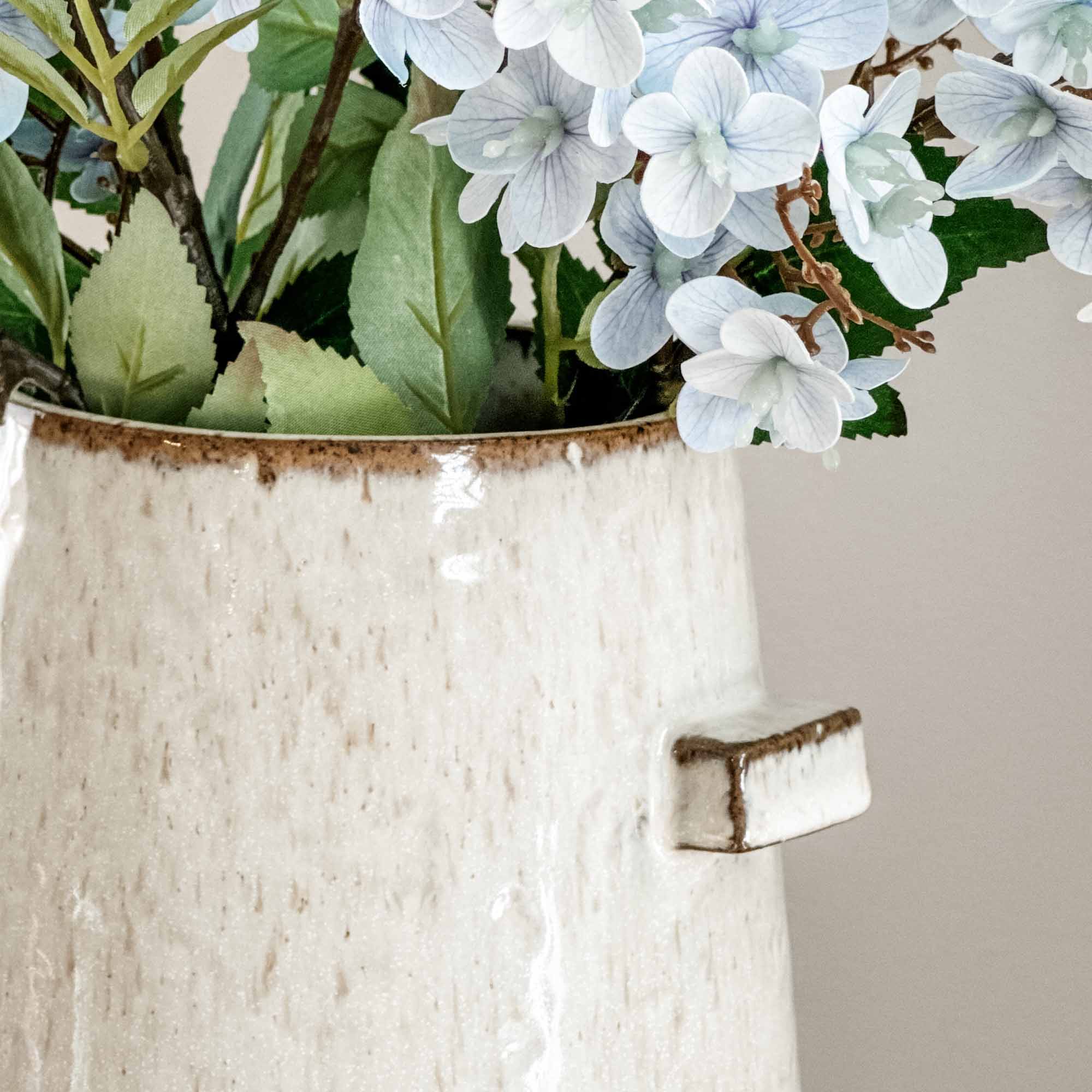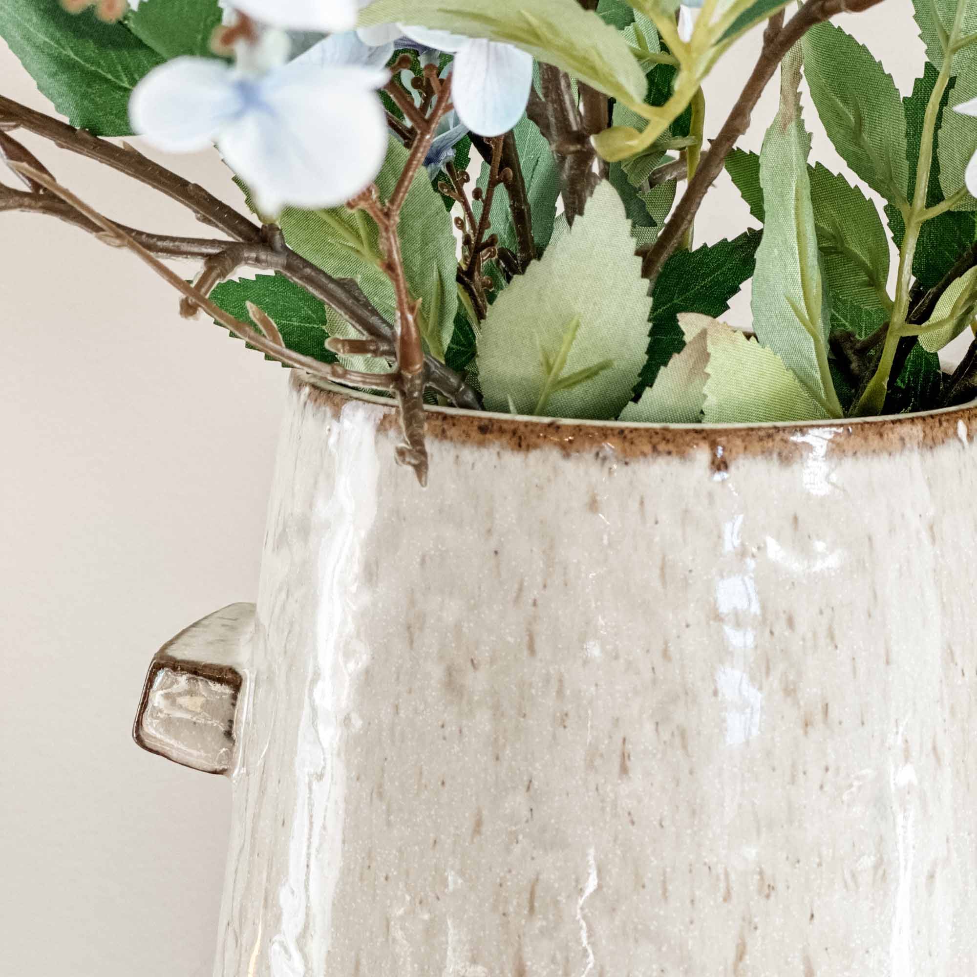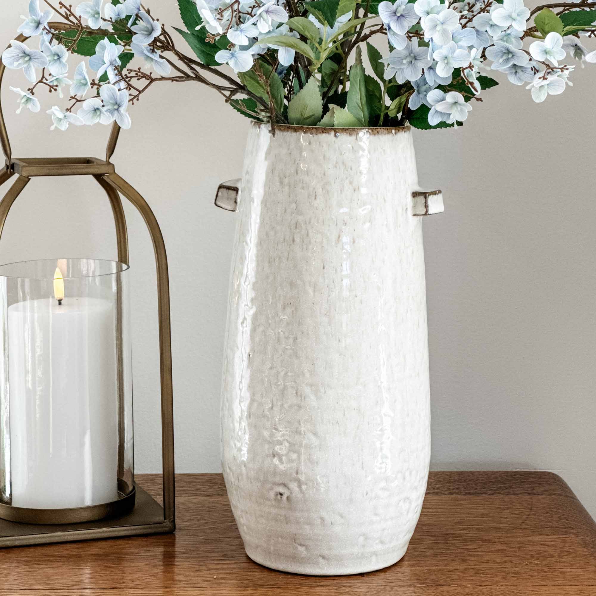 Bring on the casual luxury and natural, visual interest of glazed pottery with this large, Ceramic Handle Vase. Effortlessly adding a timeless warmth and richness to every setting, the vase offers a signature style to your interiors as only ceramics can. Whether you simply display the accent on its own on a shelf, or create a vignette with other creamy-white pottery this statement piece is sure to add visual value and interest to every setting. Fill the vase with flowers or cuttings, real or faux for a luxurious, elaborate presentation that draws attention and applause from all who see it. The pitcher has a unique, contemporary silhouette, that offers unmatched style and updated design to your cozy cottage and rustic decor.