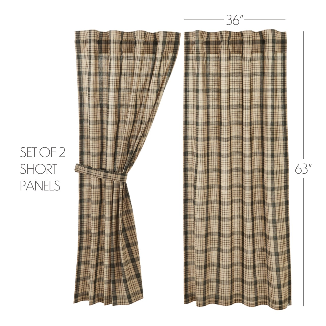 Bypass the glare of the sun while adding primitive decor to your windows with the Cider Mill Plaid Panels. Soft white cotton lines the curtains with a straight-edged, textured slub weave that showcases the beautiful light taupe, khaki, green, black and russet brown hues for a timeless country appeal. The panels feature both a 3.0″ rod pocket and back tabs, offering alternate hanging options. Two matching fabric tiebacks are included as well. Set/2.