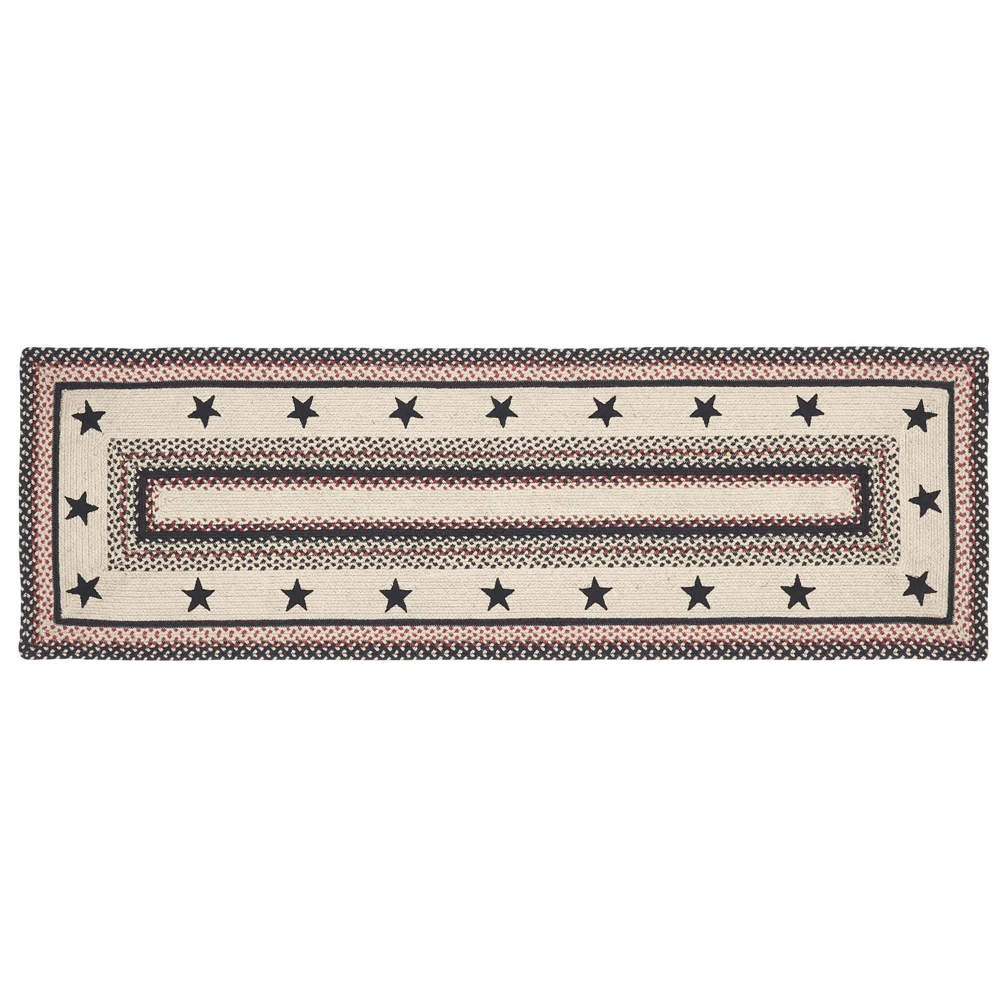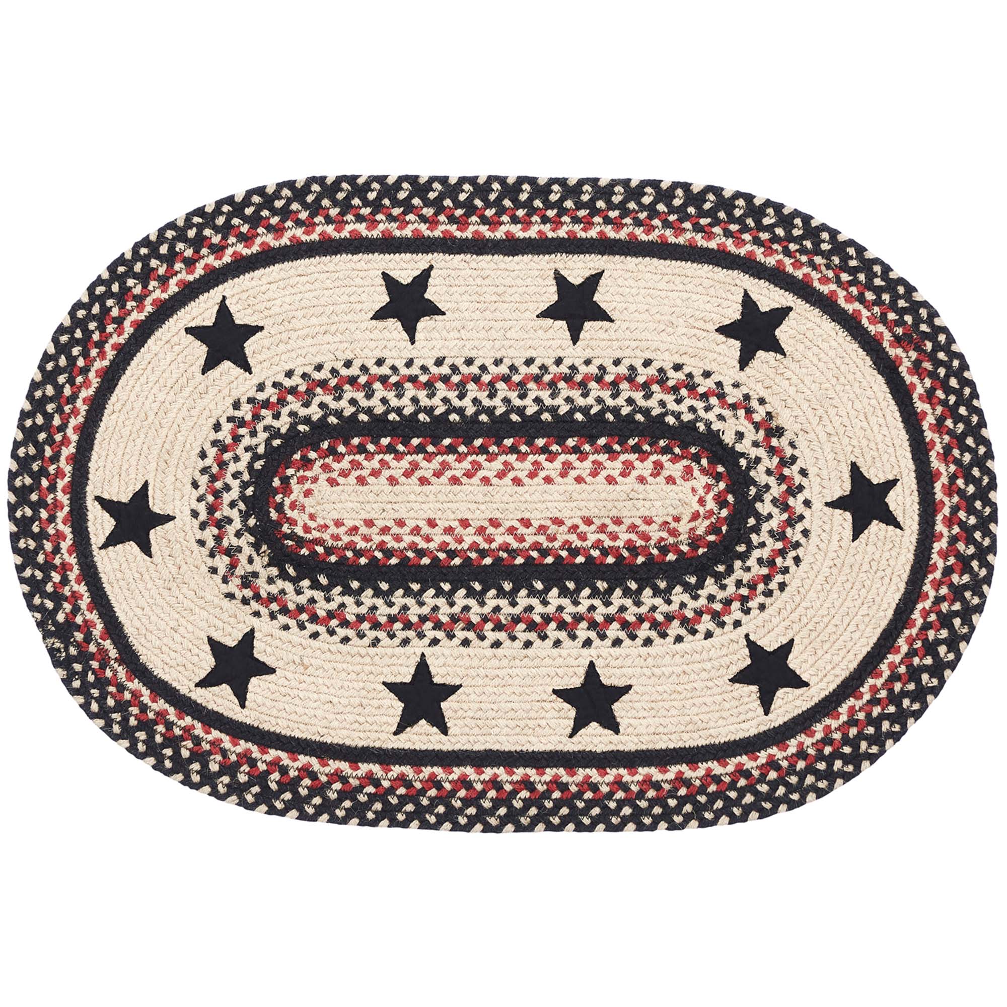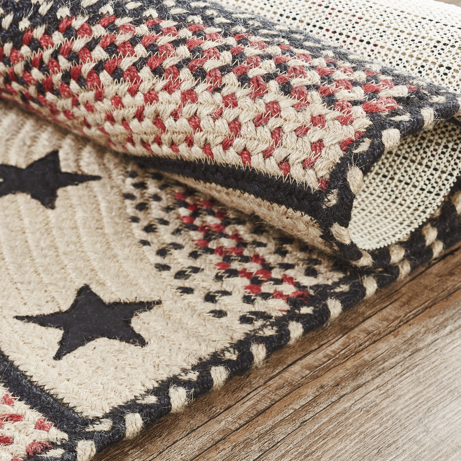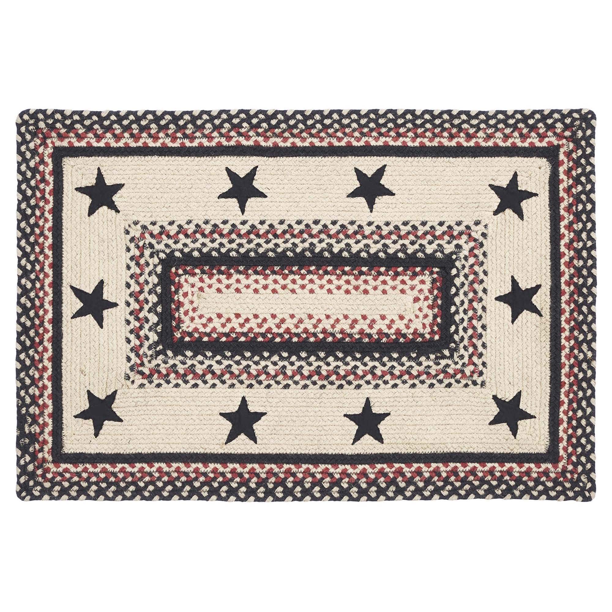 The Colonial Star Jute Rug showcases beautiful concentric solid and mixed braids of rich warm colors with black colonial star appliques. This rug will add a fresh crisp look to your country, primitive farmhouse style. Machine stitching holds braiding together even with increased wear and tear. Reverses to the same as the front. We will be happy to send you a sample of this pattern for a minimum charge to assist you in your selection.