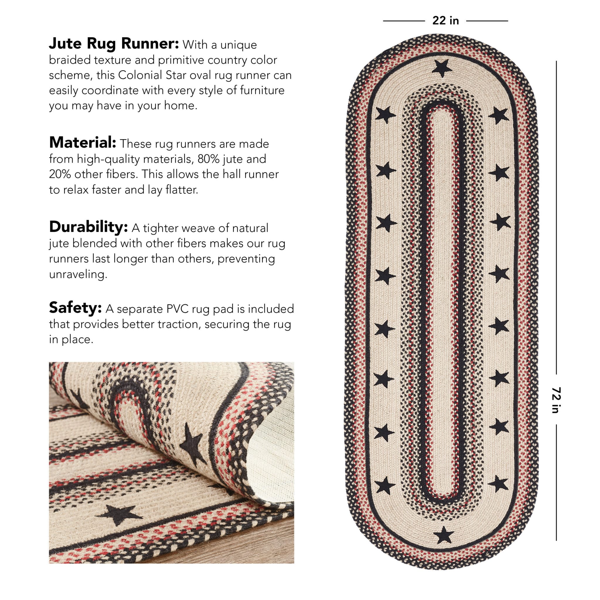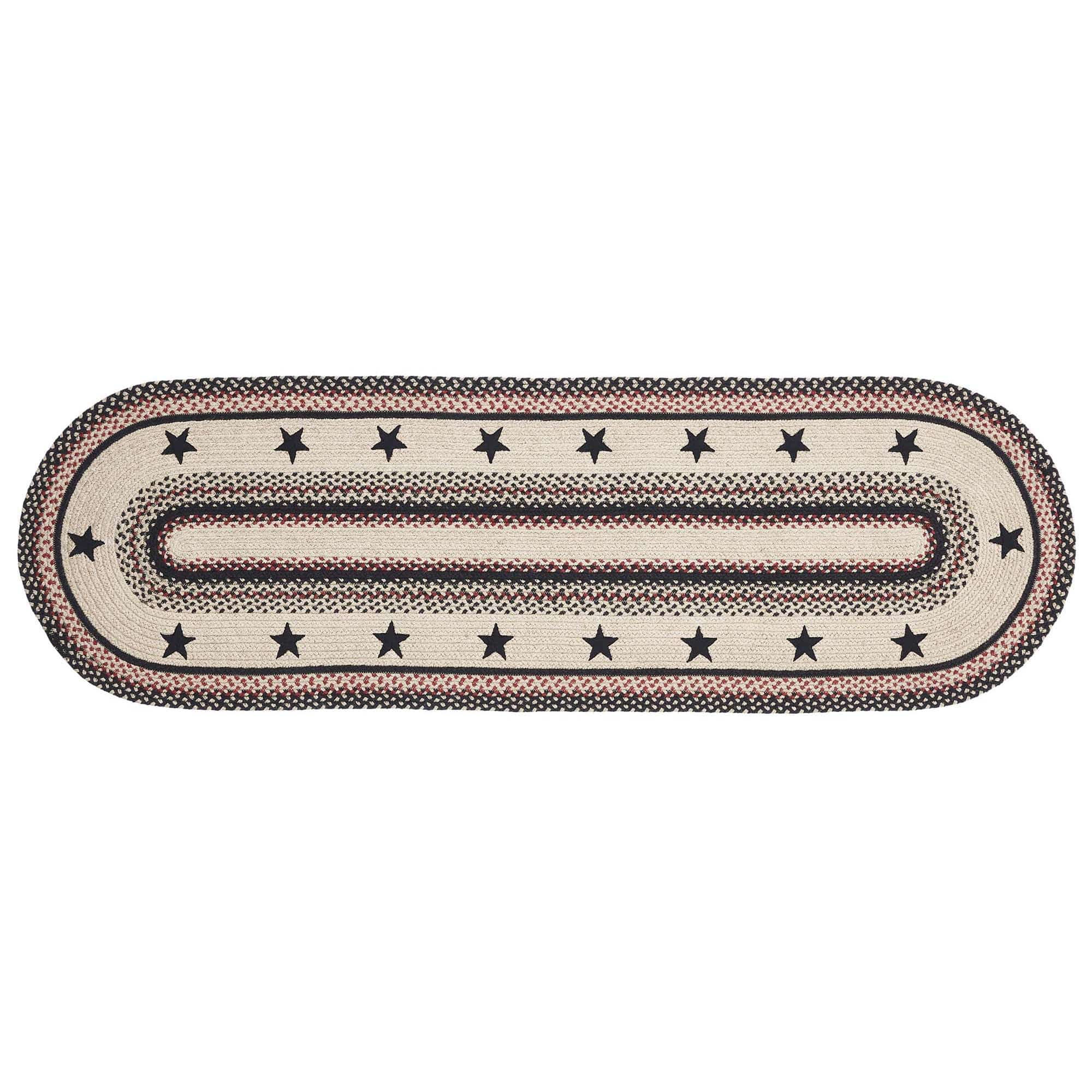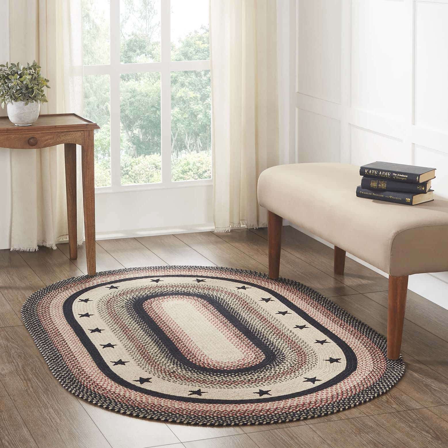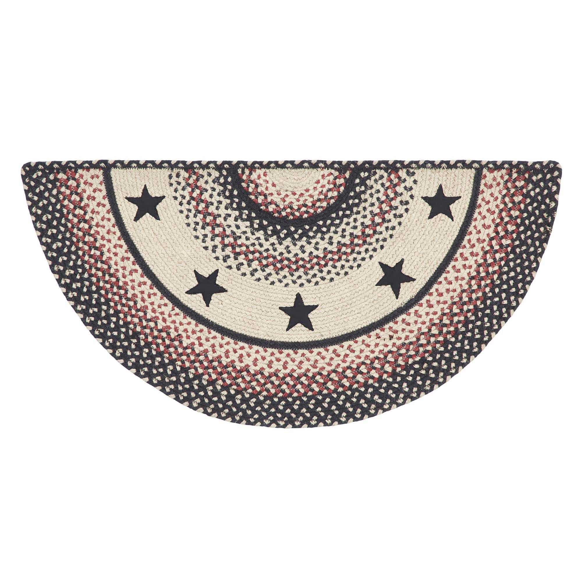 The Colonial Star Jute Rug showcases beautiful concentric solid and mixed braids of rich warm colors with black colonial star appliques. This rug will add a fresh crisp look to your country, primitive farmhouse style. Machine stitching holds braiding together even with increased wear and tear. Reverses to the same as the front. We will be happy to send you a sample of this pattern for a minimum charge to assist you in your selection.