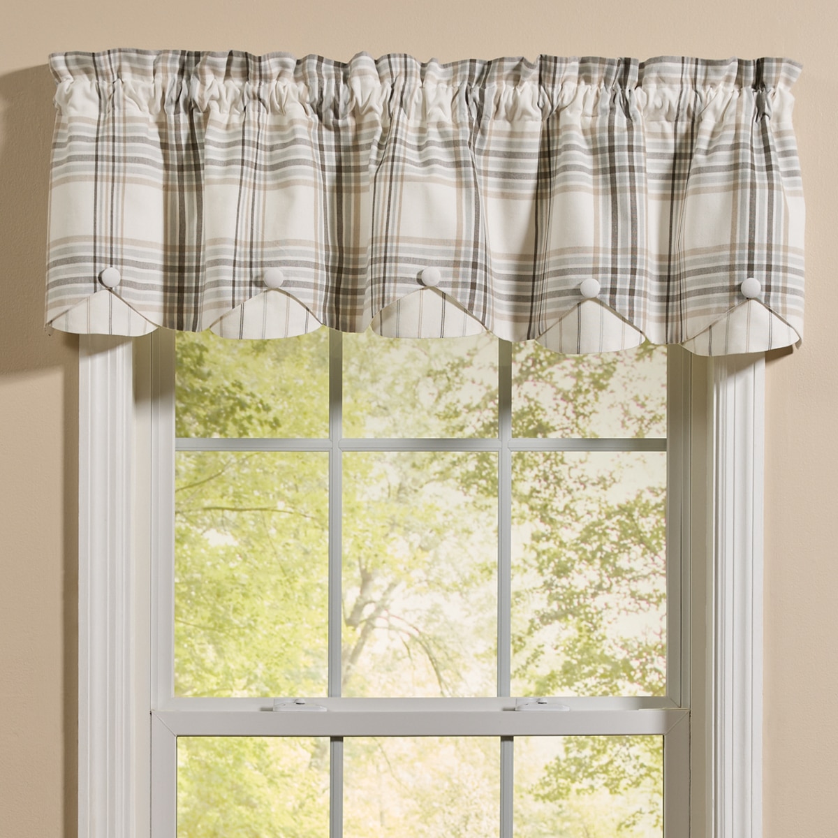 Bring a touch of rustic elegance to your windows with this farmhouse-inspired Countryside Lined Scalloped Valance, blending two timeless patterns—delicate plaid and vintage-style ticking—for a look that is both charming and refined. The soft hues of light gray, taupe, and misty blue create a serene and inviting atmosphere, making it a perfect addition to farmhouse, coastal, or cottage-inspired spaces. Designed for easy hanging, the top features a 1.5″ header and a 2″ rod pocket, allowing it to slip easily onto a standard curtain rod for a smooth, gathered look.