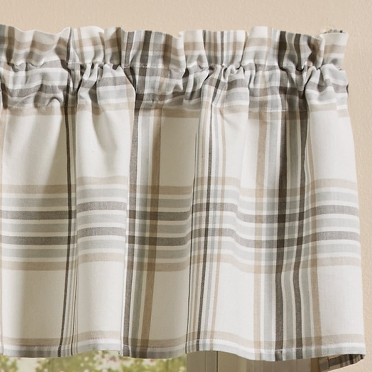 Elevate your windows with the soft elegance of this plaid valance, designed in a tranquil blend of light gray, taupe, and misty blue. Its subtle color palette creates a calming and inviting ambiance, making it a perfect addition to farmhouse, coastal, or cottage-inspired spaces. Crafted from high-quality cotton, this valance drapes beautifully, filtering natural light while adding a refined touch to your décor.
