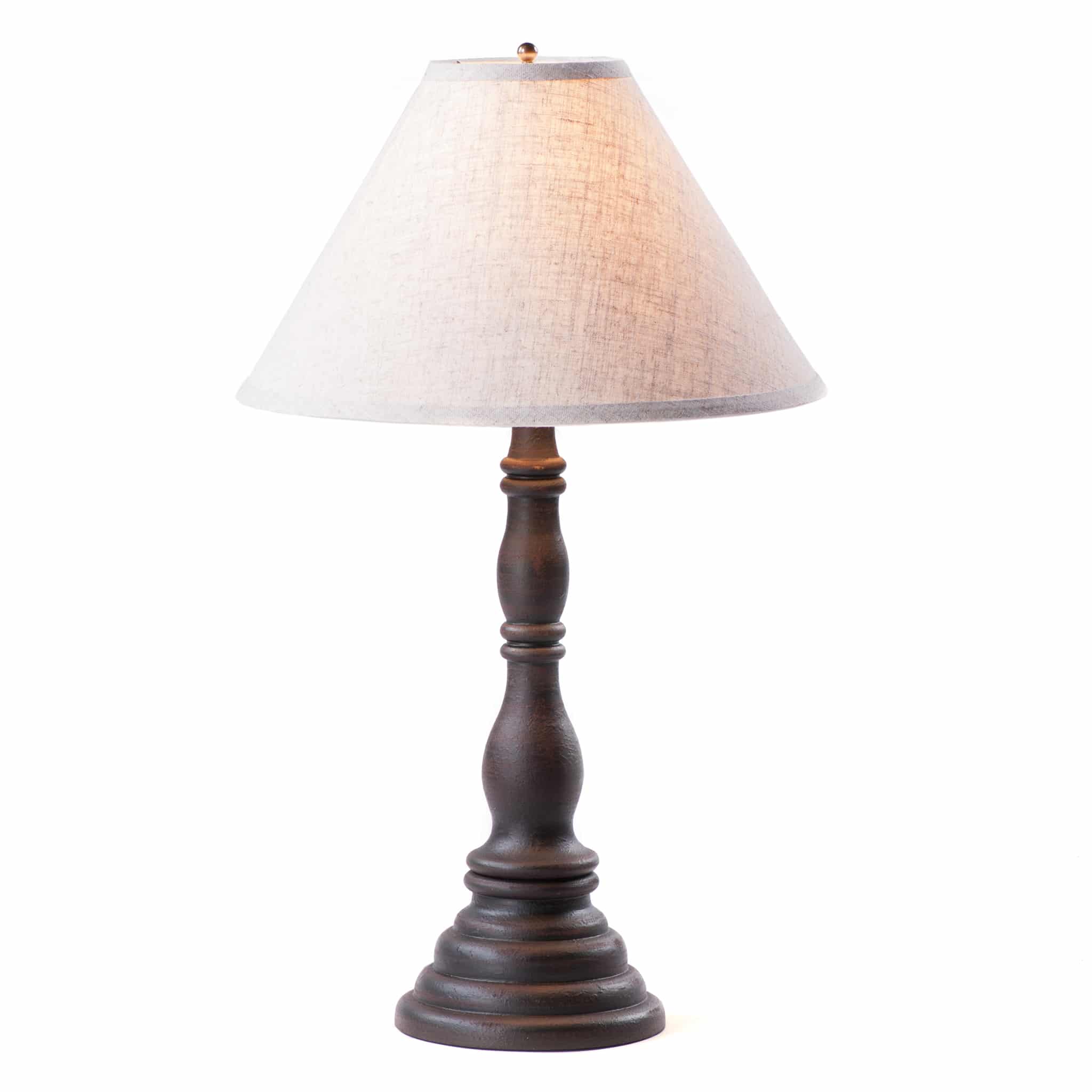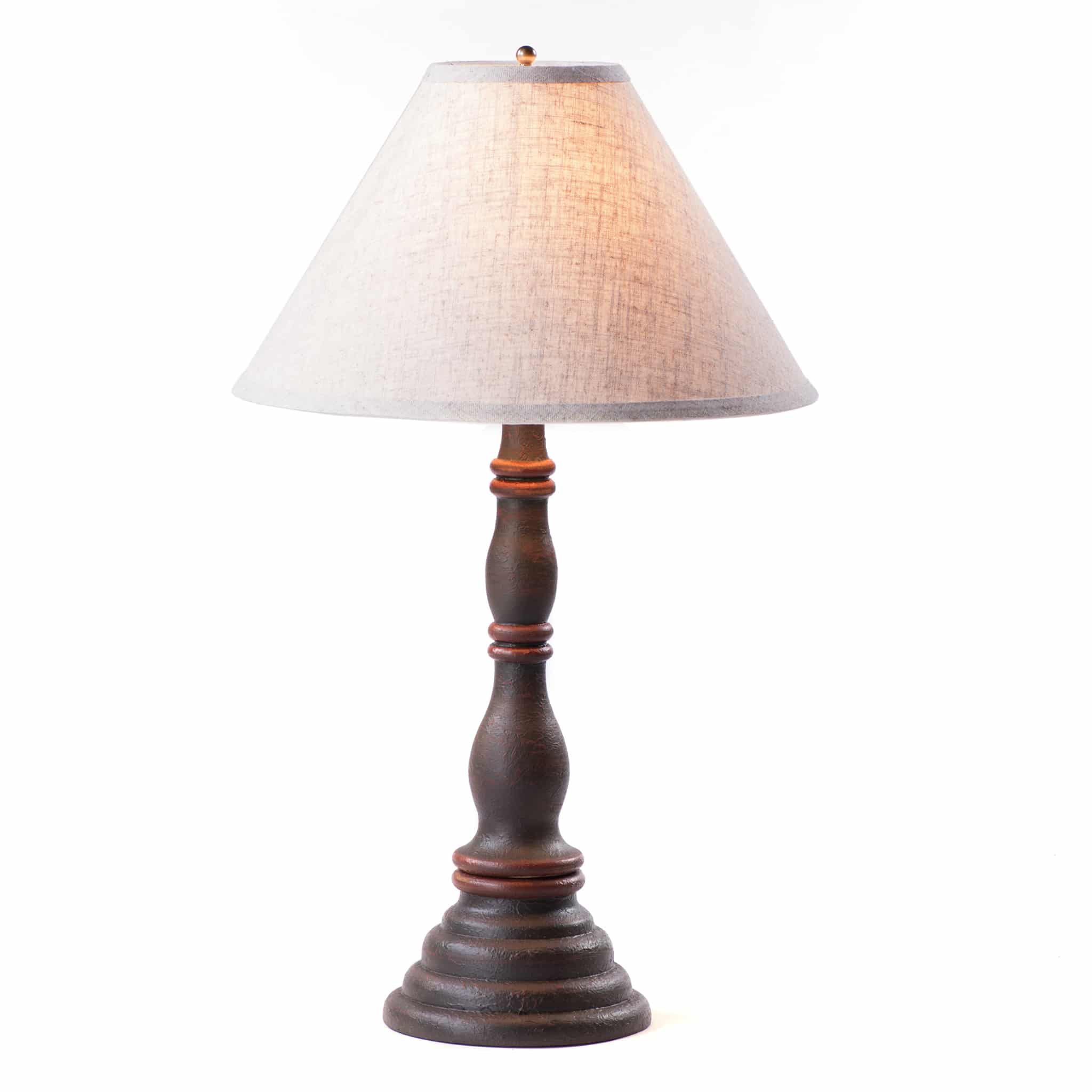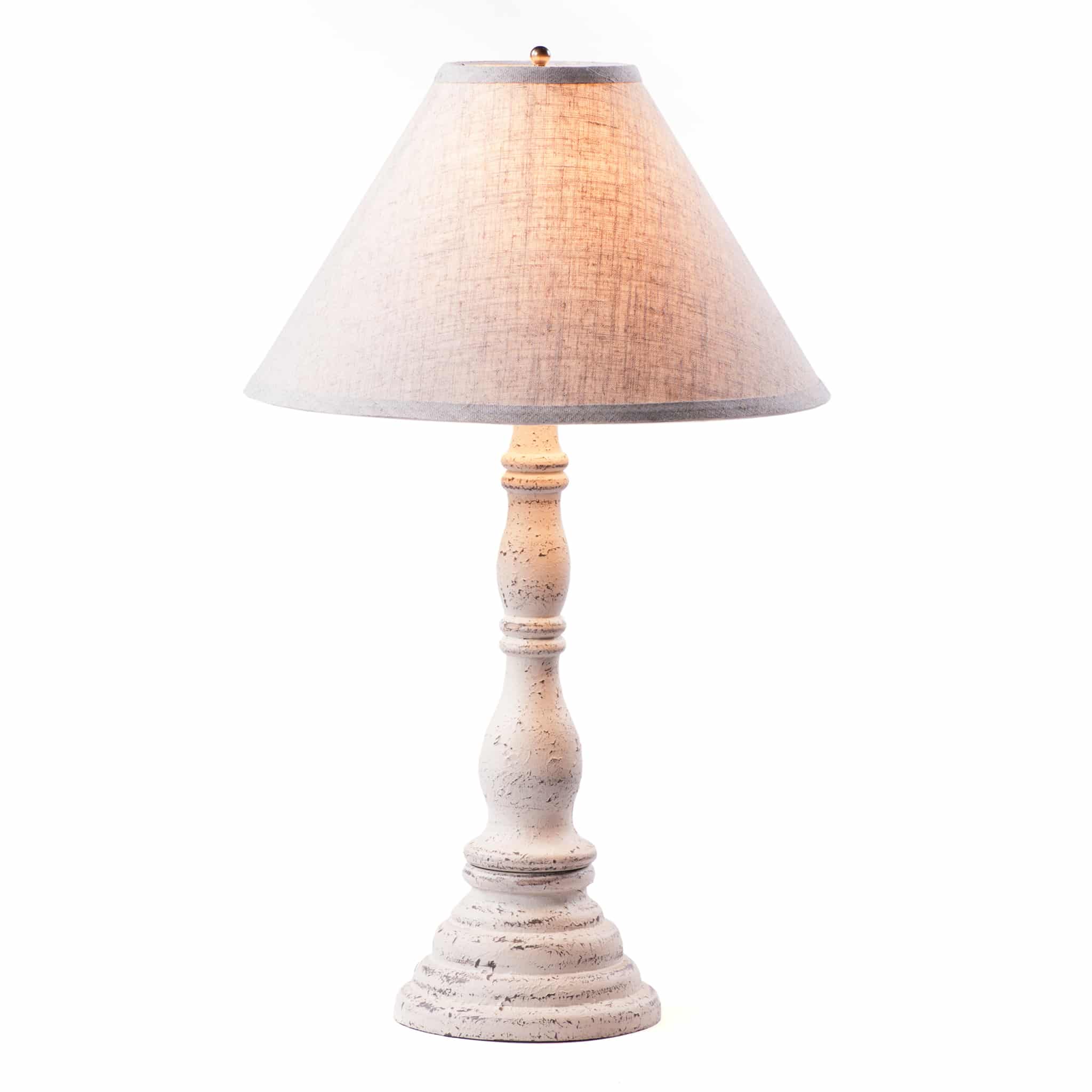A medium-sized lamp that will work well in your office, family room, or entryway. A graceful-looking lamp with a distressed, textured paint finish. The base, crafted from solid Poplar hardwood and hand-painted for a rustic look, ensures durability and timeless appeal. One single standard socket, 150 watts maximum. Includes a 15″ ivory linen fabric shade. Handcrafted in Pennsylvania. This lamp is UL approved and has a 5-year guarantee. Base Size: 25 1/2″H; Shade Size: Top 5 1/2″, Bottom- 15″, Side- 9 3/4″