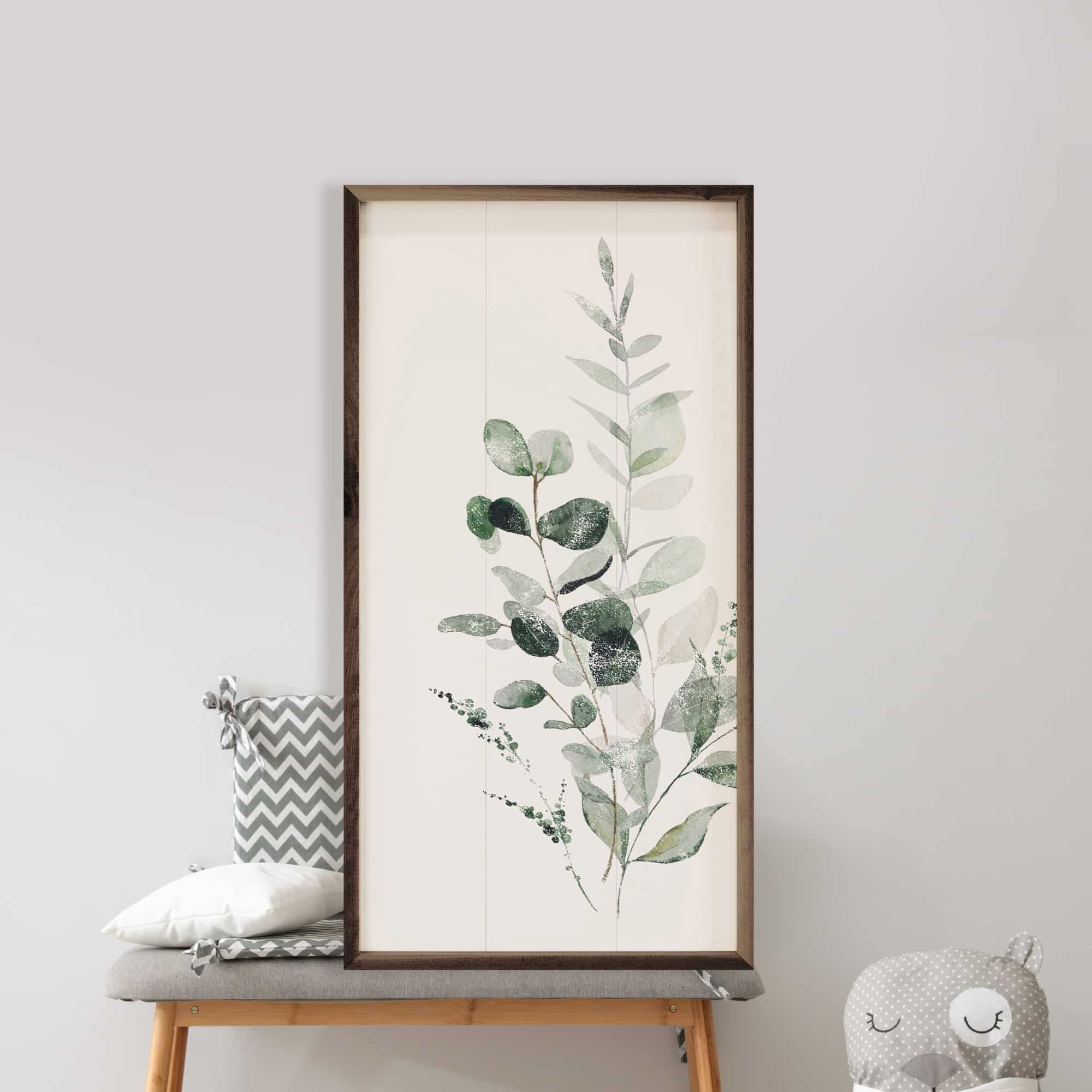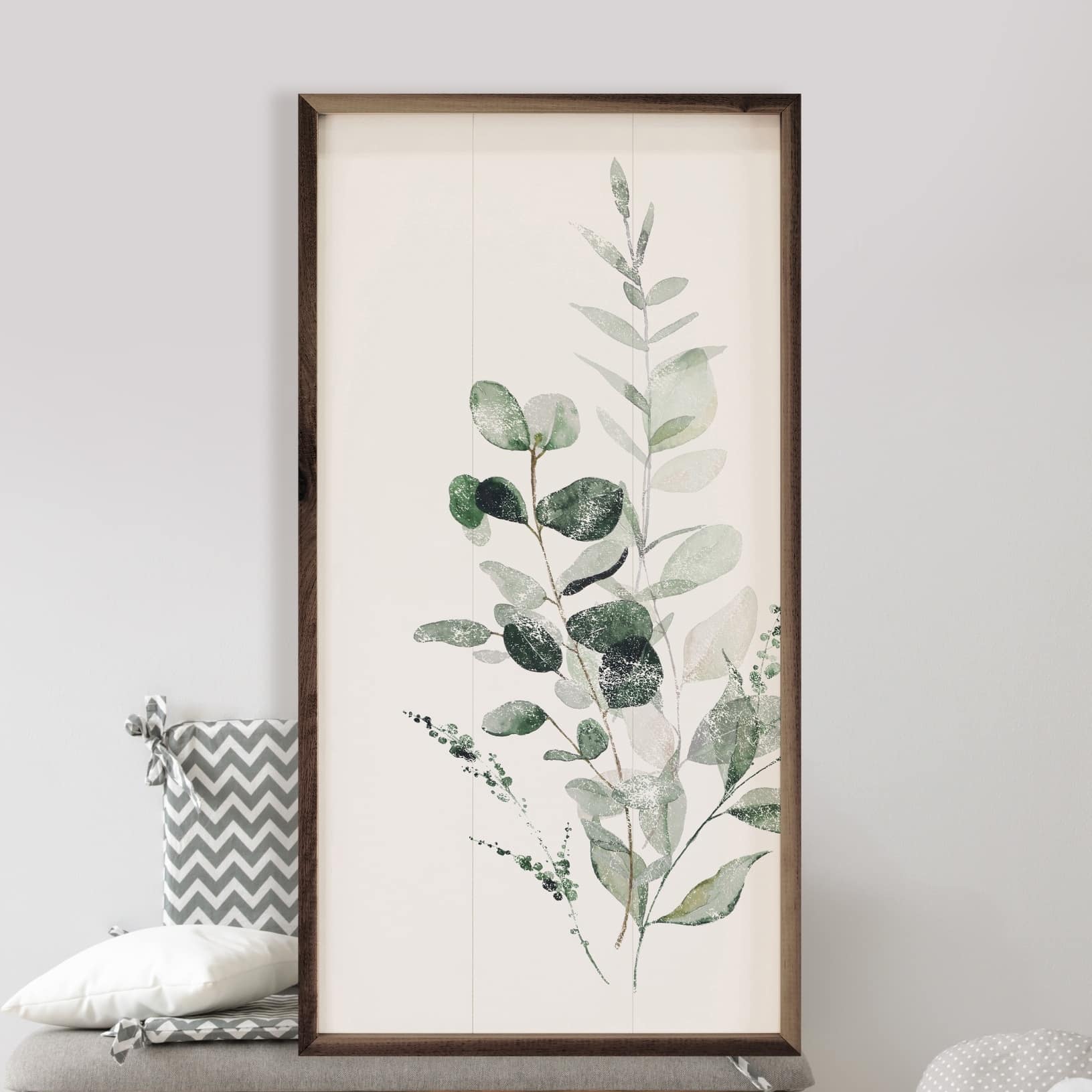 A gorgeous rendering of live cuttings in soft, gray-green watercolor tones is the central theme of this subtle, yet captivating wall hanging. Designed to grace your home with a fresh, delicate image that brings a natural sophistication and elegance to your springtime display. No need for words on this beautiful accent, which silently adds the simple artistry we find in nature, seamlessly blending into your seasonal designs. The branch is positioned slightly off-center, which adds visual interest with a modern touch. Finishing the sign with a walnut box-frame completes the look with natural warmth and added dimension,