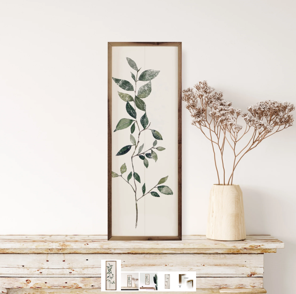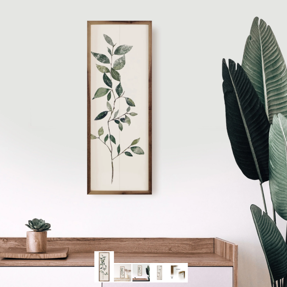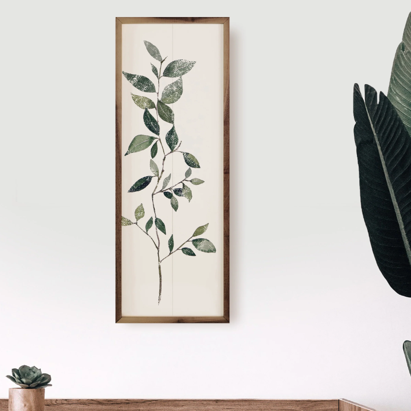Simple and serene, the Distressed Leaf Two Wooden Sign brings a calming, botanical charm to your wall space. Featuring a tall, slender branch with painterly green leaves, this piece blends artful distressing with natural elegance. The leaves are lightly textured and worn for a timeworn look that complements farmhouse, transitional, and modern organic styles. The white background and wooden frame provide a clean, rustic finish that pairs beautifully with both neutrals and earth tones. The basic walnut frame adds dimension and natural warmth, finishing the look with sophisticated simplicity. Signs are made to order.