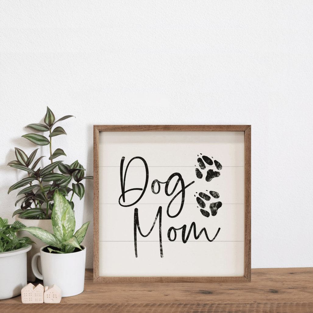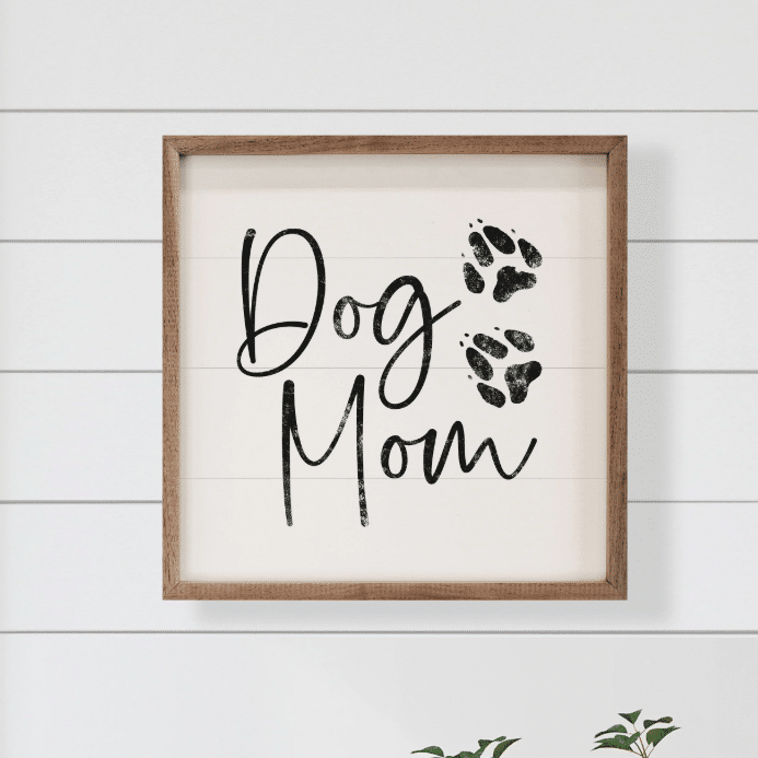 Celebrate your pup-loving spirit with this charming Dog Mom Wooden Sign. Featuring playful script lettering and two distressed black paw prints, this sign adds personality and warmth to any dog-friendly space. The design is printed on horizontal wood slats, giving it a subtle shiplap look, and is finished with a natural wood frame for a cozy farmhouse feel. Perfect for your entryway, kitchen, or above your dog’s favorite napping spot, it makes a thoughtful gift for the proud dog mom in your life—or a fun treat for yourself! Signs are made to order.