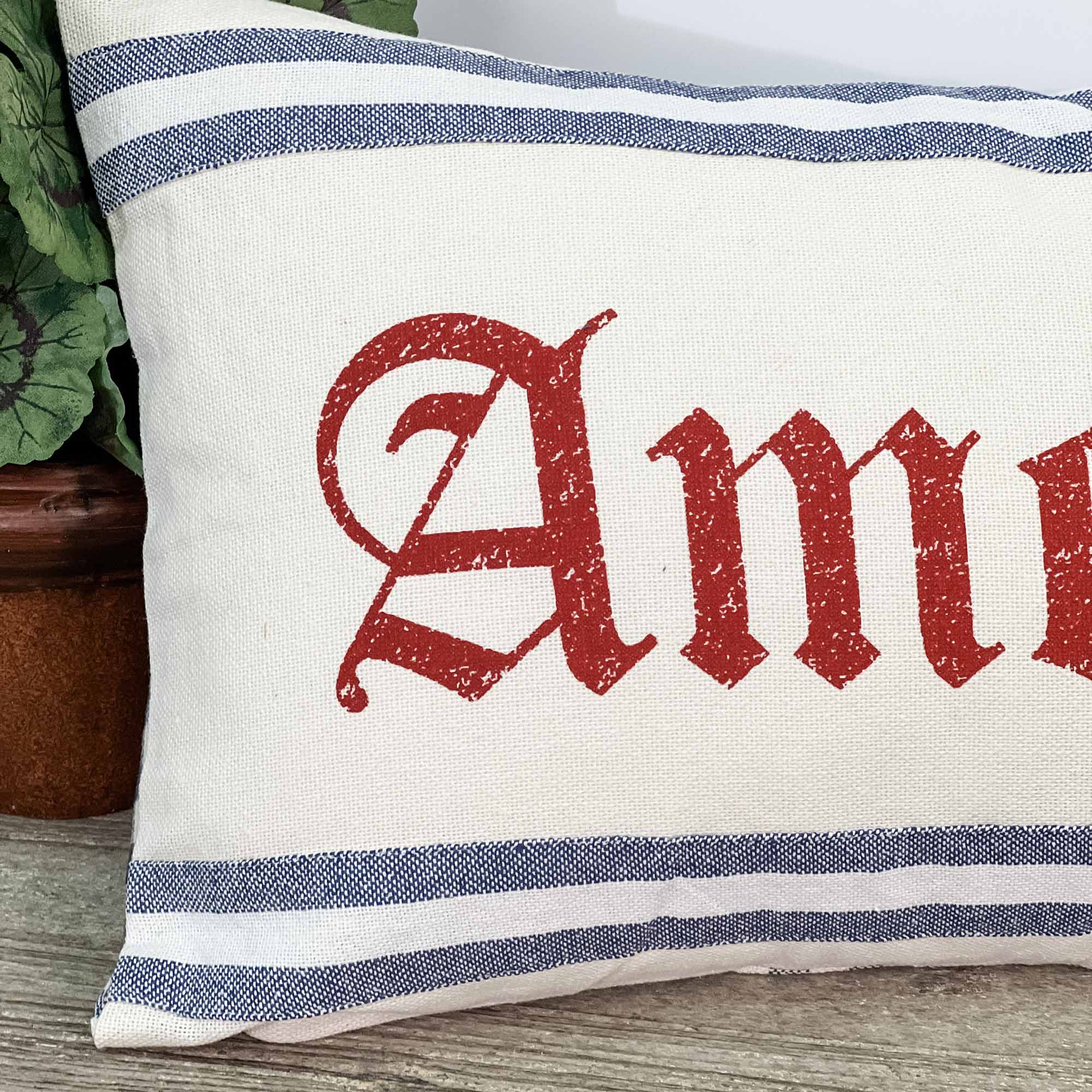 We absolutely adore the patriotic flair and charming good looks of the red, white, and blue Doylestown America Pillow Cover. On the small side, but making a monumental statement, “America” is boldly stenciled in red old English script, in the center of the pillow. Blue and white stripes are appliqued to the top and bottom of the pillow, spotlighting the word “America”. The pillow cover reverses to vintage gingham fabric in blue and white tones and is outfitted with two wooden buttons to keep the insert secure. A 3″ overlap of fabric at the opening creates stability for the buttons and longer life for the sham. (One extra button is sewn inside the sham, just in case!)