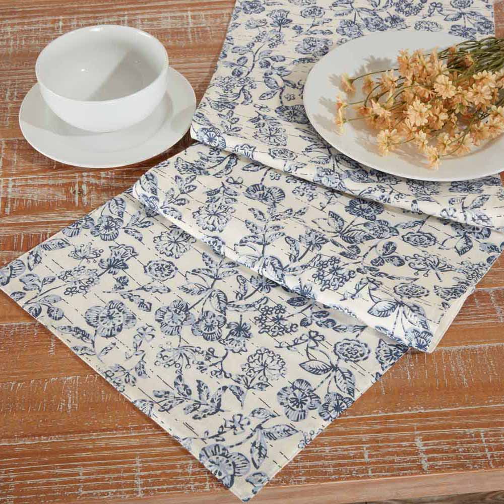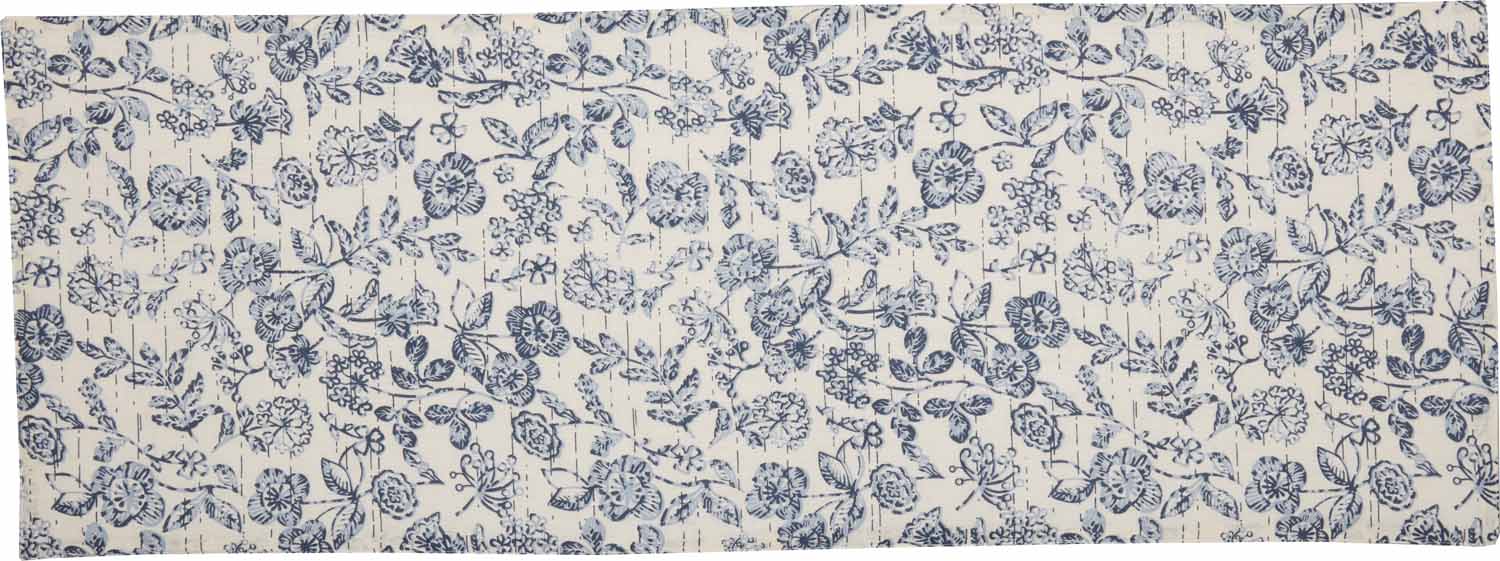 The Doylestown Runner features a design of dusty blue flowers with deeper blue accents on a warm, creamy background. Updated and fresh, the unique look adds a welcome energy and dynamic charm to your cozy farmhouse table top. The fabric introduces a distinctly feminine touch, softening every setting. The runner reverses to a creamy sheeting fabric and a single-layer of flannel filling brings added weight and thickness to the accent. Created to coordinate beautifully with the entire Doylestown Collection, the floral fabric offers endless design choices that are sure to refresh your farmhouse instantly.
