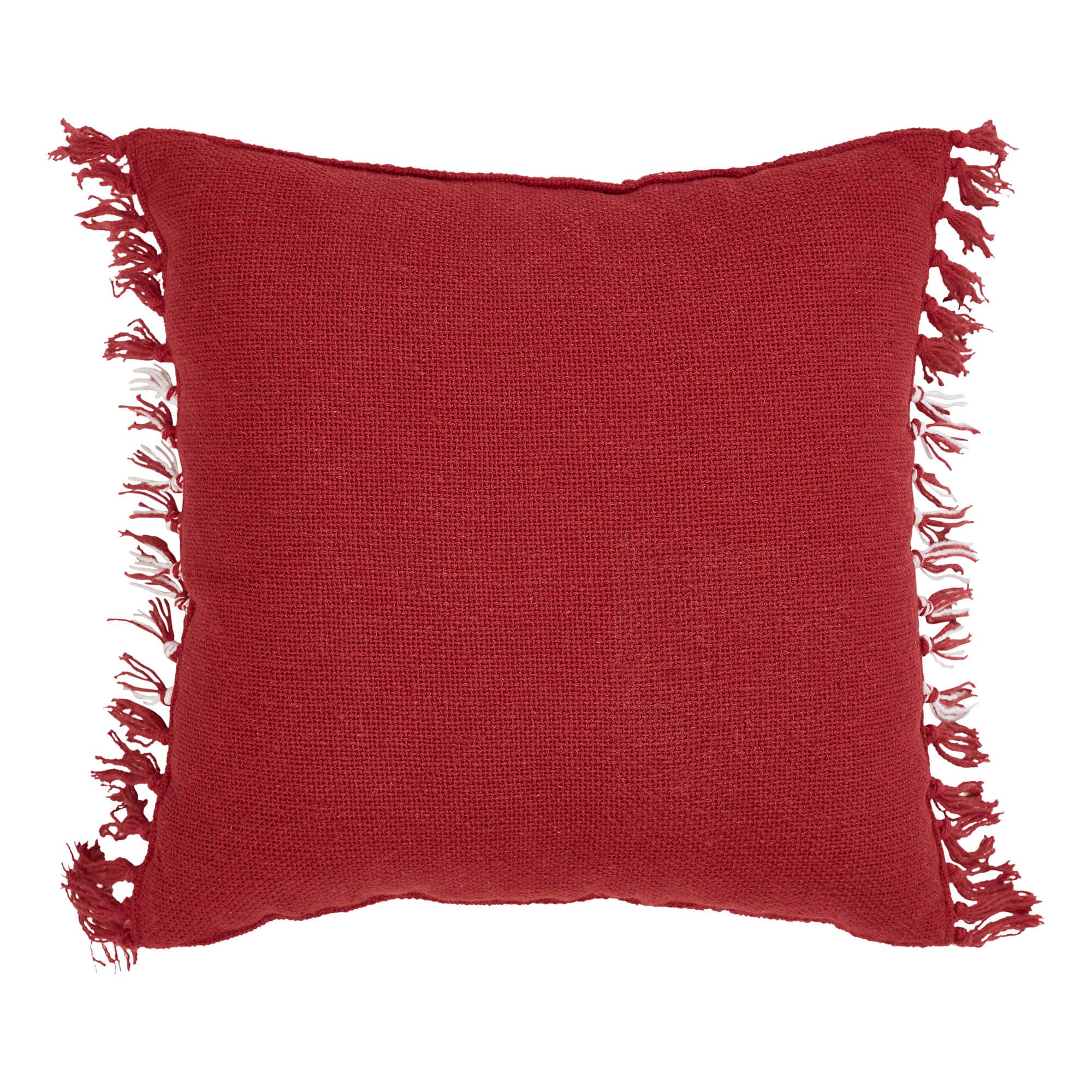 Add a pop of sophisticated seasonal style with the Eston Red White Plaid Pillow. Measuring 12″ x 12″, this charming accent pillow blends classic holiday colors with a fresh farmhouse feel. A bold red base is accented with crisp white striping in a timeless plaid design, creating just the right balance of festive cheer and understated elegance. Regularly spaced tassels along the edges add playful texture and a unique touch, while the reversible design—finished in a simple solid red—offers versatile styling for the season.