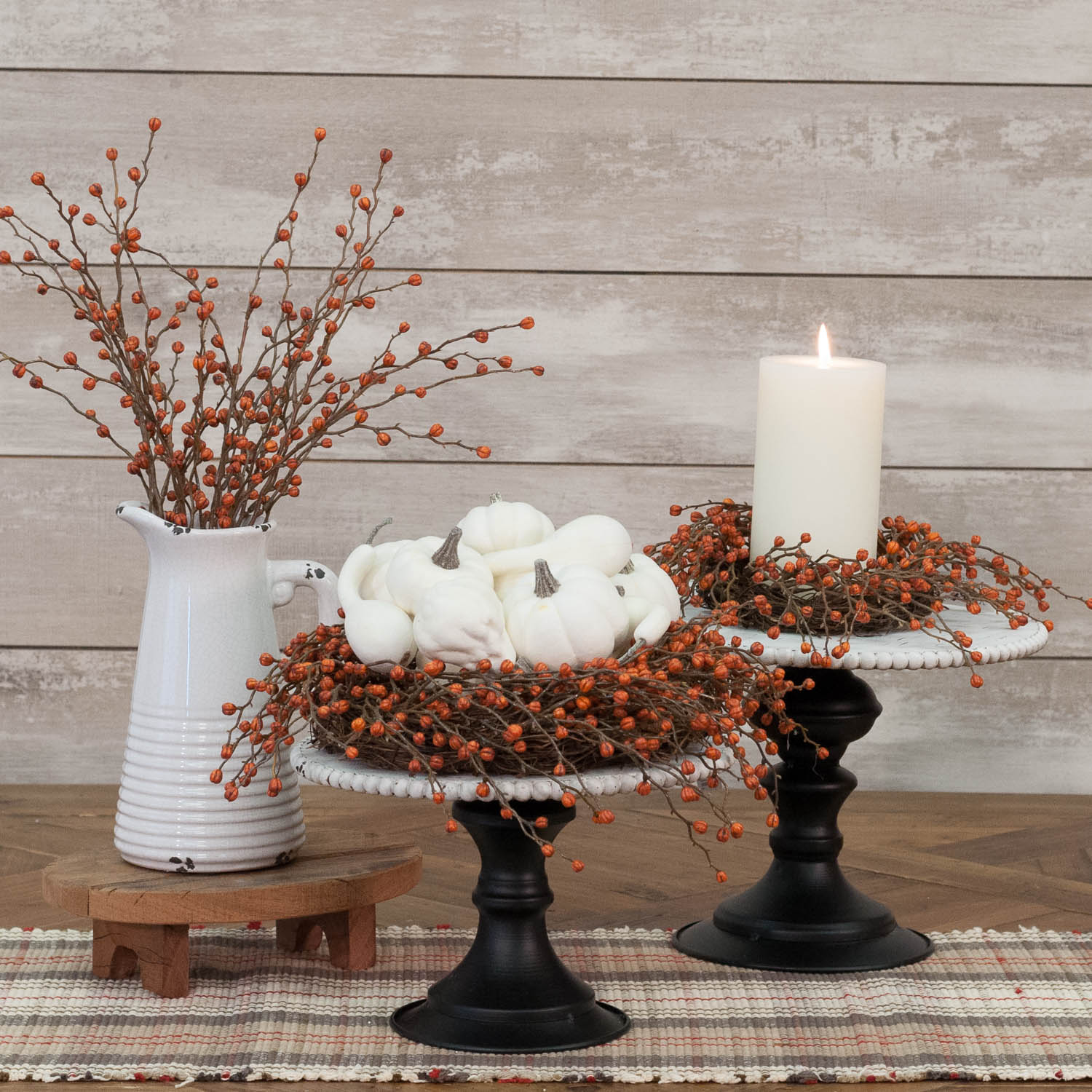 You’ll find countless ways to dress up your fall farmhouse with these Mini Pumpkins this season. With lifelike details and warm, creamy tones, the decorations are a sure bet for your autumn displays, no matter what color scheme you favor. Fill a tall glass container or wooden bowl with these mini pumpkins and gourds, add wheat, hops or bittersweet and voilà: you have a striking tabletop display. Or, you could line a windowsill, mantel or open shelf with the faux gourds for a simple, seasonal finale. Set/16.