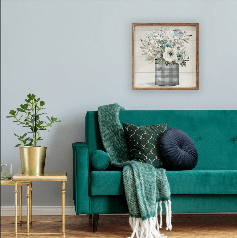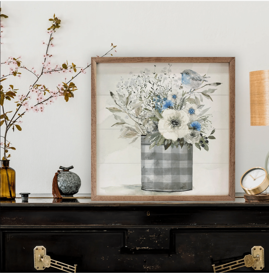 This beautifully rustic wooden sign showcases a soft watercolor-style arrangement of delicate white and blue florals in a charming buffalo-check metal bucket. A dainty bluebird perched above adds a touch of whimsy and nature-inspired charm. The muted color palette and airy composition make this piece a perfect fit for farmhouse, cottage, or shabby-chic decor. Framed in warm wood, it brings a serene and timeless feel to any space, whether displayed in a kitchen, entryway, or living room. Signs are made to order.