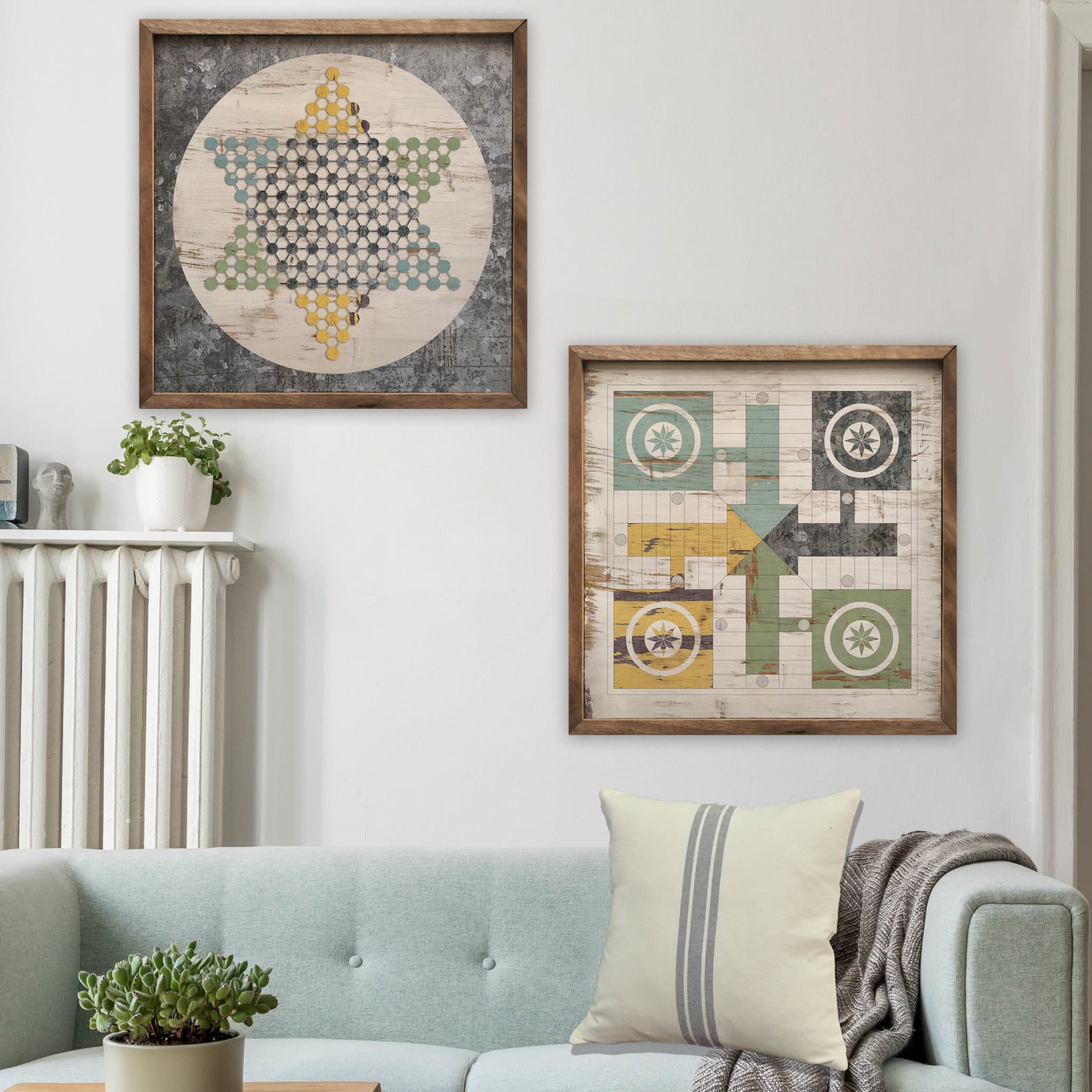 Remember the primitive game boards in days gone by? We thought it was time to give those cool old game boards a fresh farmhouse look! So we designed a collection of gameboard signs with a weathered vintage feel that’s updated for today’s modern farmhouse home. Each gameboard design is gorgeous on it’s own, or group a few together for a stunning wall display. Each square gameboard is available in a variety of sizes so you can order the size that works best for your space. The Farmhouse Chinese Checkers gameboard features mustard, sage green, and blue-green circles on an antique white “weathered” board with a distressed gray border. Our gameboards are designed as wall decor, so they do not come with game pieces and this version does not have actual holes for marbles. However, we think a handful of old buttons would work perfectly when you’re ready to challenge someone to a fun game!