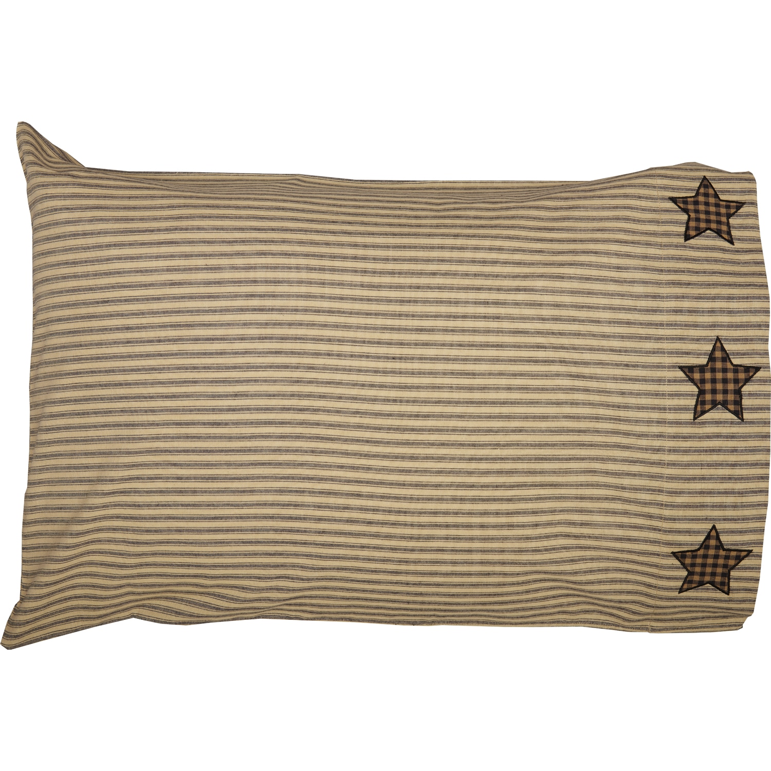 Add a touch of vintage, farmhouse-inspired comfort to your bedding with the generously sized Farmhouse Star Pillow Case Set. Classic ticking stripes in charcoal and khaki tan add a timeless feel while applique accents in a rustic buffalo plaid add five-point stars for a primitive design. Complete with 100% cotton for a soft, breathable feel and rustic shades of brown and black to create a comfy and casual look that will match your country-style decor.