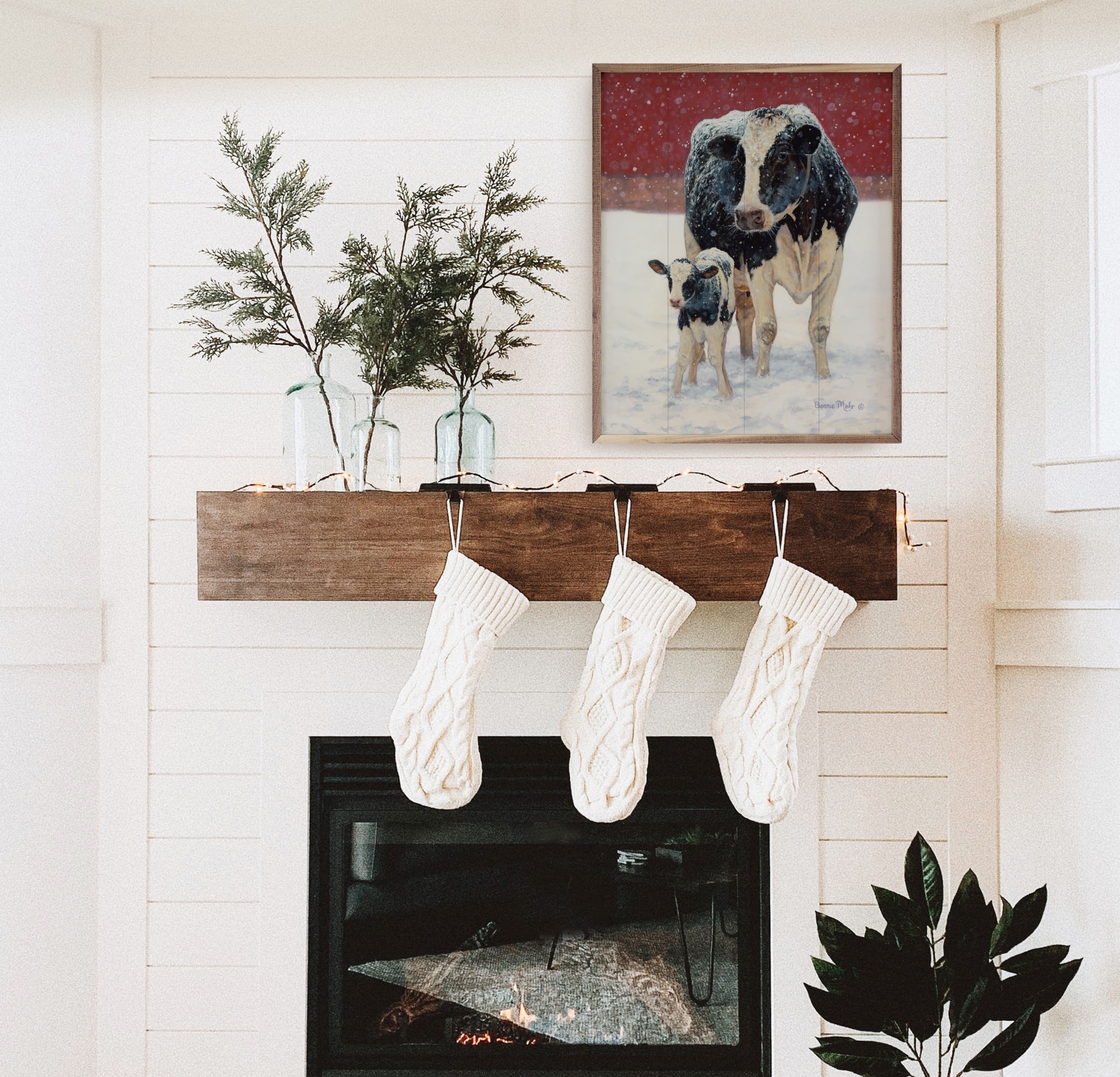 What a delightful, realistic image of a mother and baby Holstein by Bonnie Mohr. The darling pair are beautifully positioned ankle-deep in snow, with a red barn wall serving as a backdrop. They are dusted in the lightest covering of snow and flakes continue to softly fall in this unique, evocative barnyard image. Finished in a natural walnut frame that compliments the image perfectly, the overall look brings a wonderful addition to your winter displays. Signs are made to order.