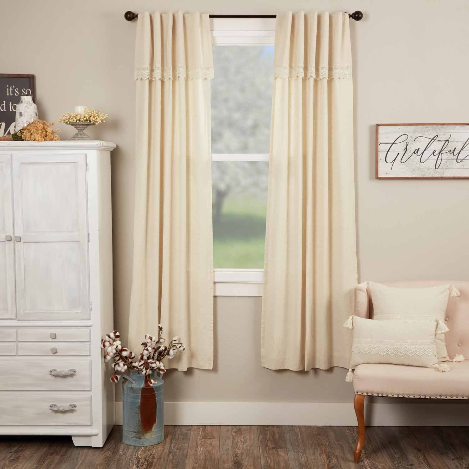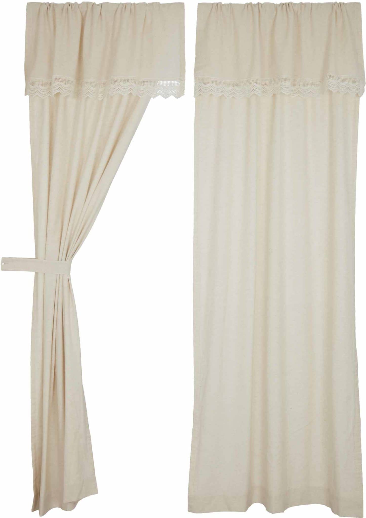 When you want to add farmhouse finesse to your home this season, why not try our Flax and Lace Collection? The design brings home sophisticated simplicity and elemental elegance whatever your decorating style may be. The drapes with valance overlay, add layers of warm, natural softness and perfectly subtle shades of cream to your windows. Delicate, airy lace in a lighter cream contrasts gently with the fabric, creating texture, tonal interest, and pretty, feminine detailing. The graceful, scalloped curve of the applique lends an additional visual aesthetic and ornate touch to the drapes. The Flax and Lace Drapes offer a warm and gentle layer of neutral color along with finely-detailed lace accents that update, accentuate and soften your vintage cottage or rustic farmhouse. Set/2.