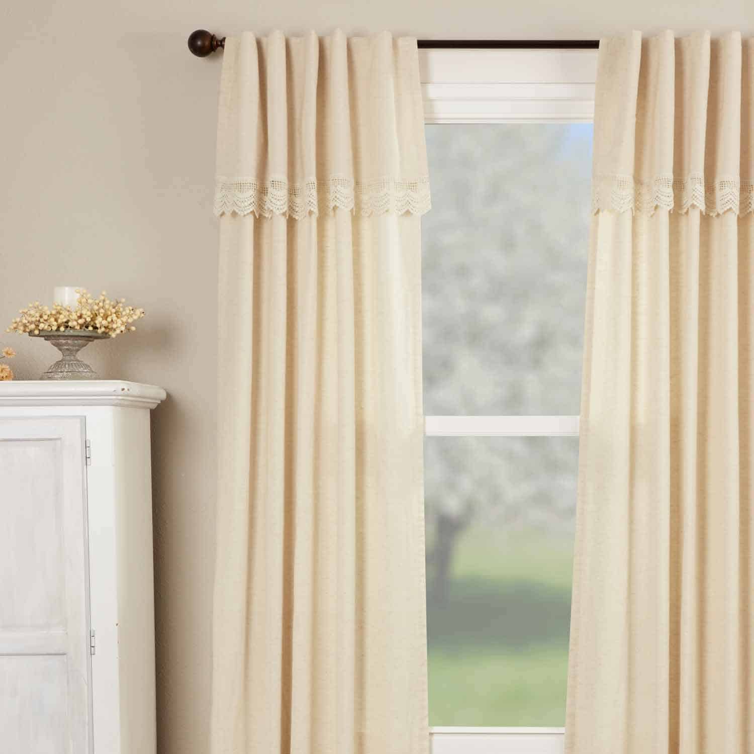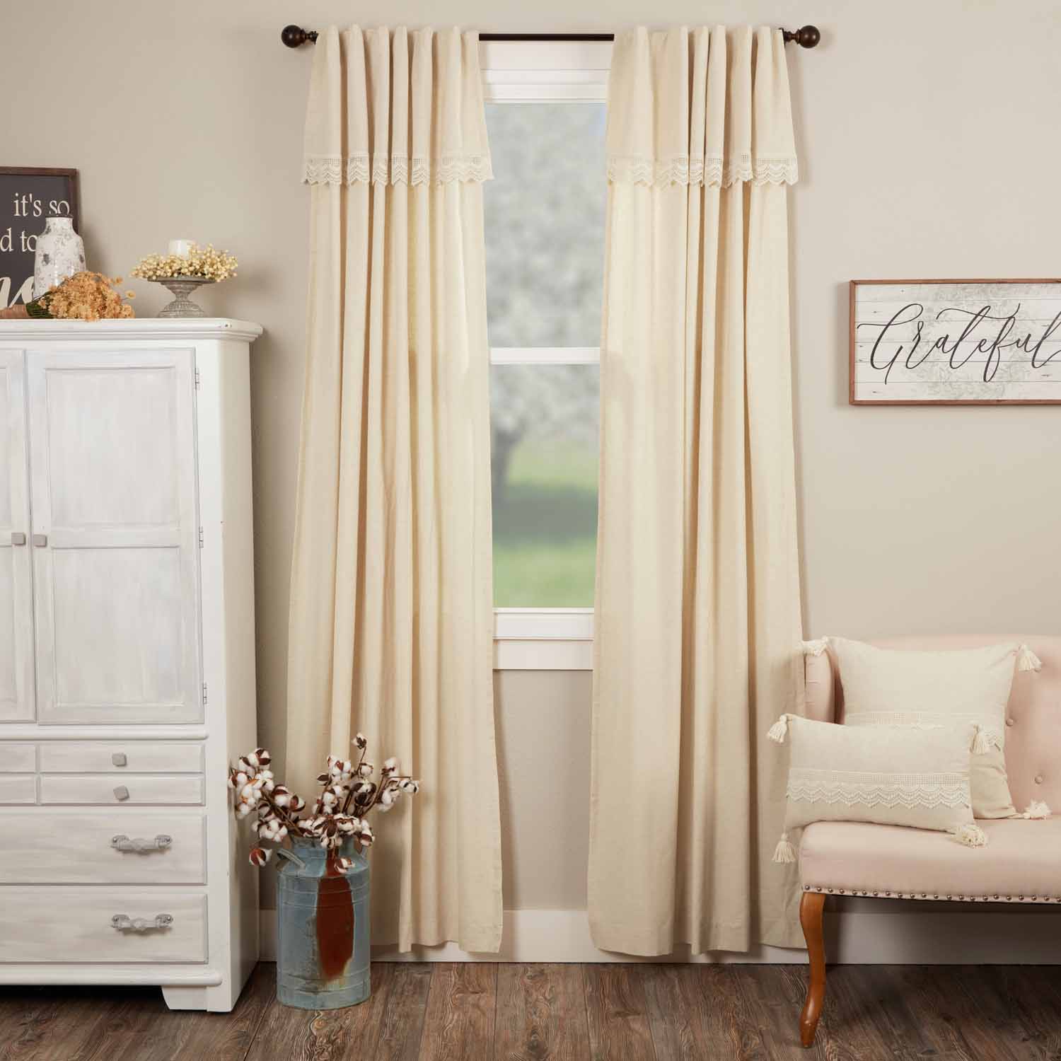 When you want to add farmhouse finesse to your home this season, why not try our Flax and Lace Collection? The design brings sophisticated simplicity and elemental elegance to your interiors, whatever your decorating style may be. The drapes with valance overlay add layers of warm, natural softness and perfectly subtle shades of cream to every setting. A delicate, airy lace detail in a lighter cream contrasts gently at the bottom of the valance, creating texture, tonal interest, and feminine detailing. The graceful, scalloped edge of the lace applique lends an additional visual aesthetic and ornate touch to the drapes. The gorgeous Flax and Lace Drapes introduce a warm and gentle layer of neutral color, along with finely-detailed lace accents that update, accentuate and soften your vintage cottage or rustic farmhouse beautifully. Set/2.