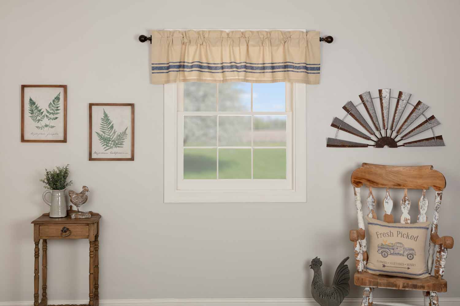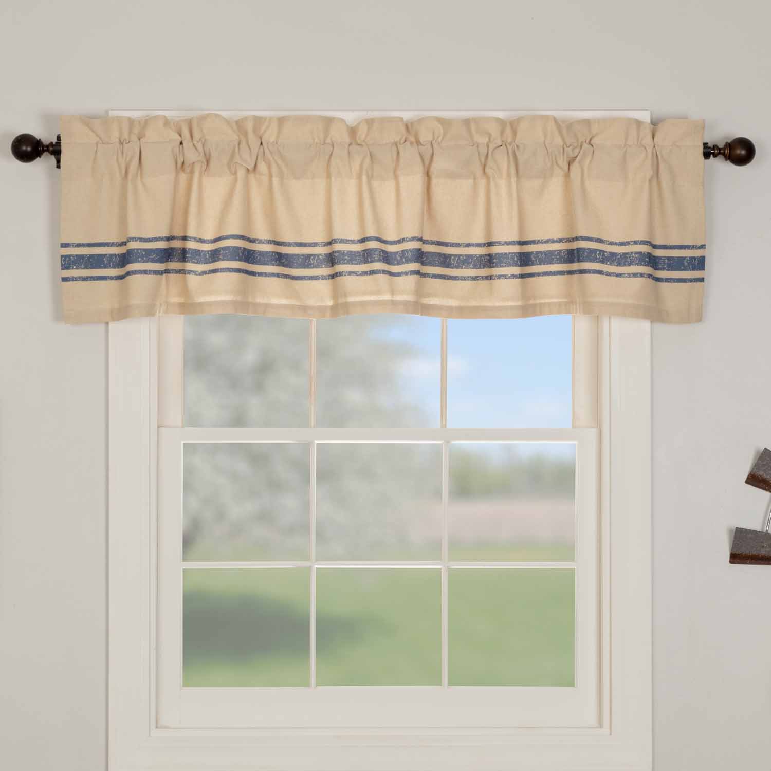 The Fresh Picked Valance brings a warm, neutral touch to your windows with a big dose of farmhouse charm and casual style. The simplicity of this valance is what makes it so special!! A basic warm beige chambray is simply dressed with three blue stripes that run horizontally along the bottom of the curtain. This easy-going look is sure to add the right understated style to your windows this season. A rod pocket as well as back tabs on the back offer different hanging options and looks for your home.