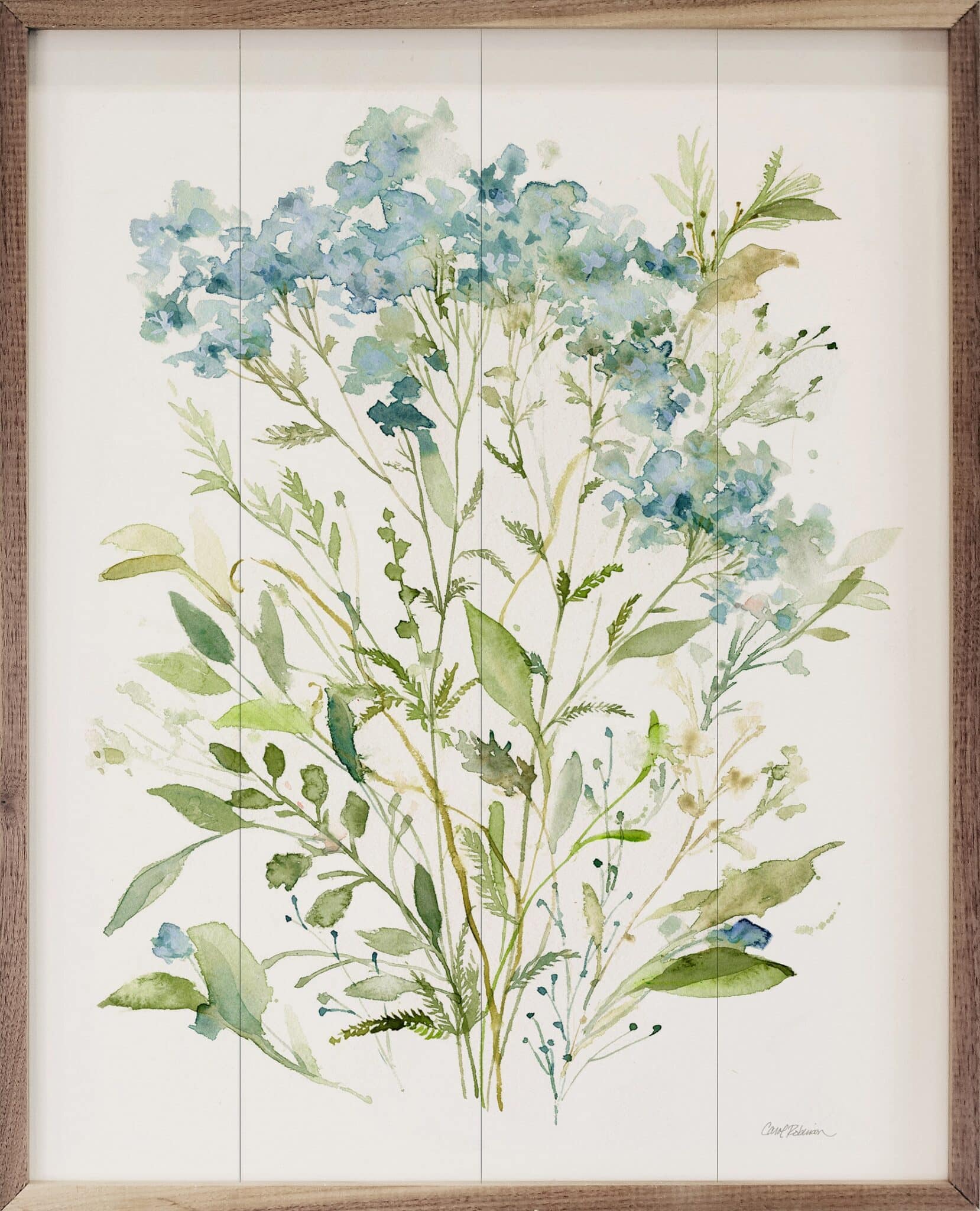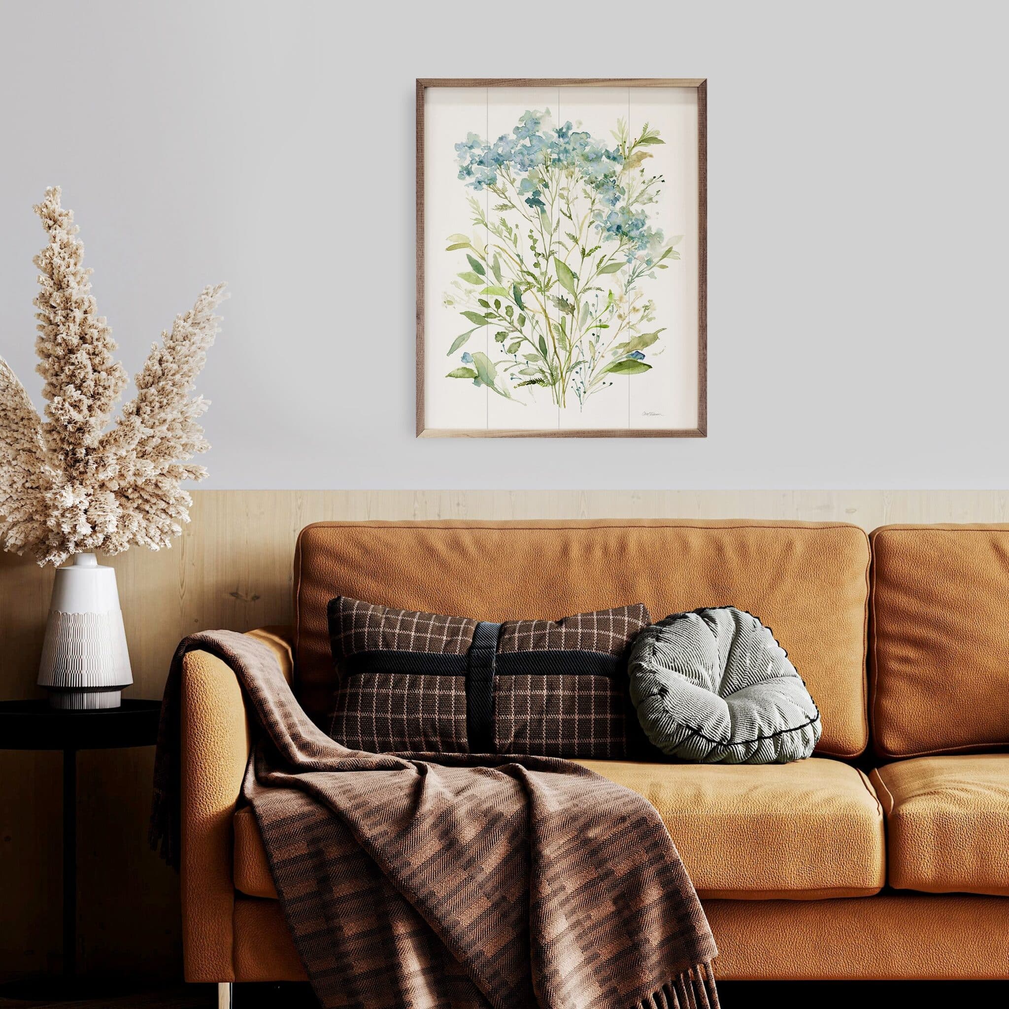 A beautiful painting, guaranteed to add life and vitality to any setting, the Garden Lace image brings gorgeous flora into your home with softly-muted, watercolor tones of blue and green. This lovely wall accent captivates your attention with its lush beauty and rich botanical details that add the luster and charm of natural cuttings to every setting. The floral painting is showcased on a creamy white background that adds rich depth and simple elegance to your cozy country, rustic farmhouse or cottage-core decor. The simple walnut frame compliments the natural blooms of this unique painting, adding a warmth that enhances the overall image.