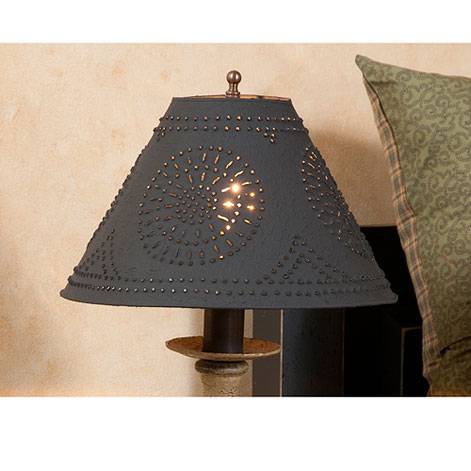 A medium-sized lamp that will work well in your office, family room, or entryway. A charming lamp with a heavily textured painted finish. Crafted from solid Poplar hardwood and hand-painted for an authentic rustic finish, it adds charm and warmth to any space. One single standard socket, 100 watts maximum. Heavily distressed Hartford colors are available. Hand-punched black textured tin shade. Handcrafted in Pennsylvania. This lamp is UL-approved and comes with a 5-year guarantee. Base Size: 19 1/2″H; Shade Size: Top 4 1/4″, Bottom- 12 1/2″, Side- 8 1/4″