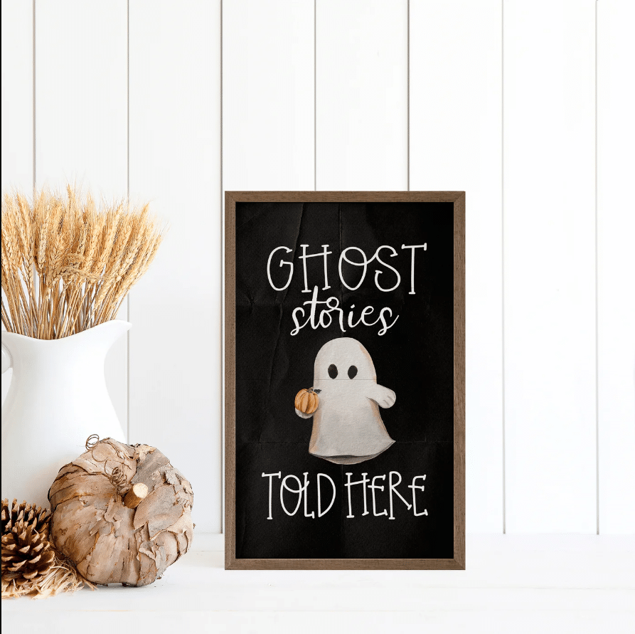 The Ghost Stories Told Here Wooden Sign is truly one of the most adorable accents we’ve seen for Halloween this season. A rich black background with soft neutral tones of creamy white and subtle gray combine in a bold sign with white lettering and one small pop of orange, creating an eye-catching, delightful decor element. Just right for your rustic vintage home or updated farmhouse, the colors blend into every current home style. A sweet, whimsical face and tiny pumpkin complete the endearing look that is sure to enhance your harvest home with a playful flair. A wooden box frame compliments the sign and adds a welcome dimension. Signs are made to order.