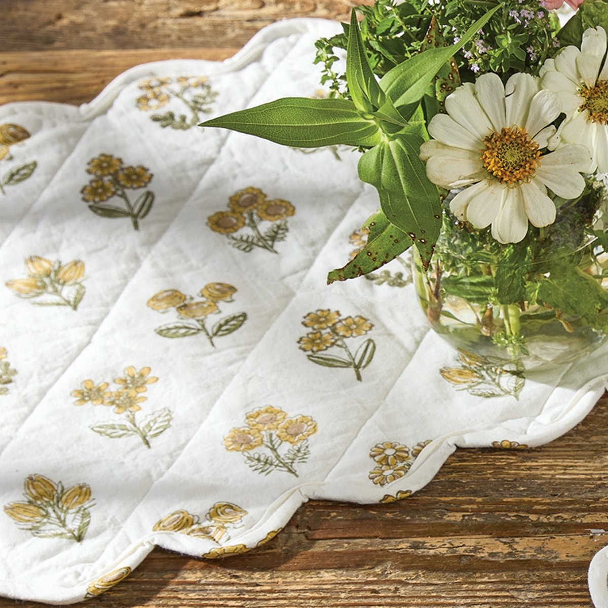 Add a touch of elegance to your dining space with the Golden Acres Table Runner. Crafted from soft cream-colored cotton fabric, this quilted table runner features a timeless design with delicate scalloped edges for a refined look. The surface is adorned with a charming print of yellow flowers with green stems, bringing warmth and beauty to any table setting. Measuring 54 inches long by 13 inches wide, it is the perfect accent for dining tables, sideboards, or coffee tables. Ideal for everyday use or special occasions, this table runner combines style and functionality to enhance your home décor.