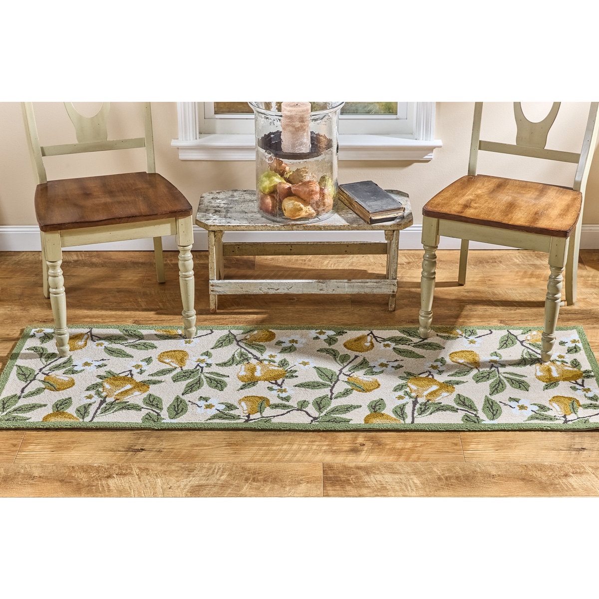 Add a graceful touch of nature to your hallway, kitchen, or entryway with the Golden Pear Hooked Runner Rug. Measuring 2 feet by 6 feet, this handcrafted piece features a delightful arrangement of golden pears and leafy branches framed by a rich green border. The hooked texture adds depth and warmth, making it both a decorative and functional accent.