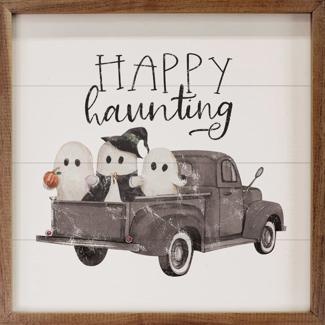 The Happy Haunting Ghost Truck Wooden Sign brings together some of our all-time favorite seasonal elements. When you combine a weathered old gray truck with a trio of the sweetest ghosts anyone could ever imagine, you have a darling, whimsical accent that will enhance your harvest home with a playful flair. A creamy-white background creates gentle contrast with gray, black, and white tones, and a bitty pop of orange draws attention to the tiny pumpkin accent. The dancy black lettering balances the design and a simple natural wood frame adds a warm touch that compliments without demanding attention. Signs are made to order.