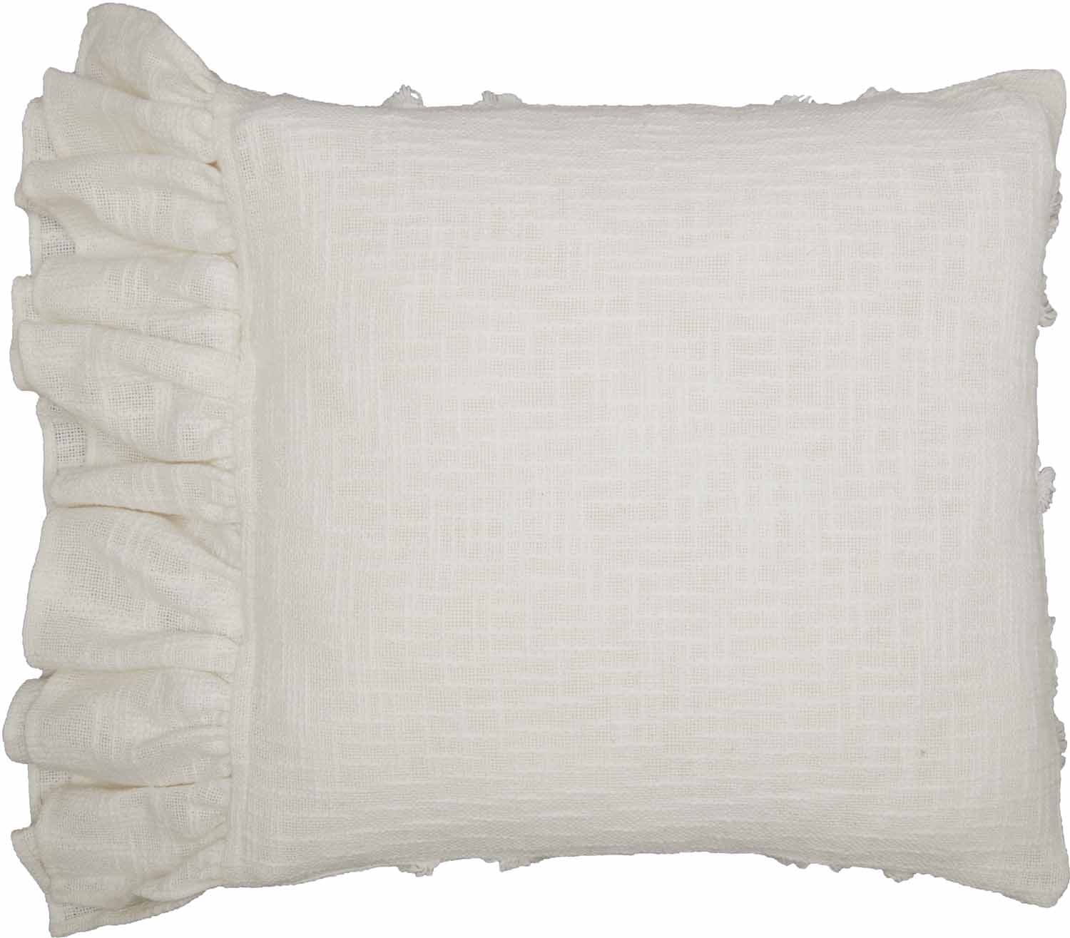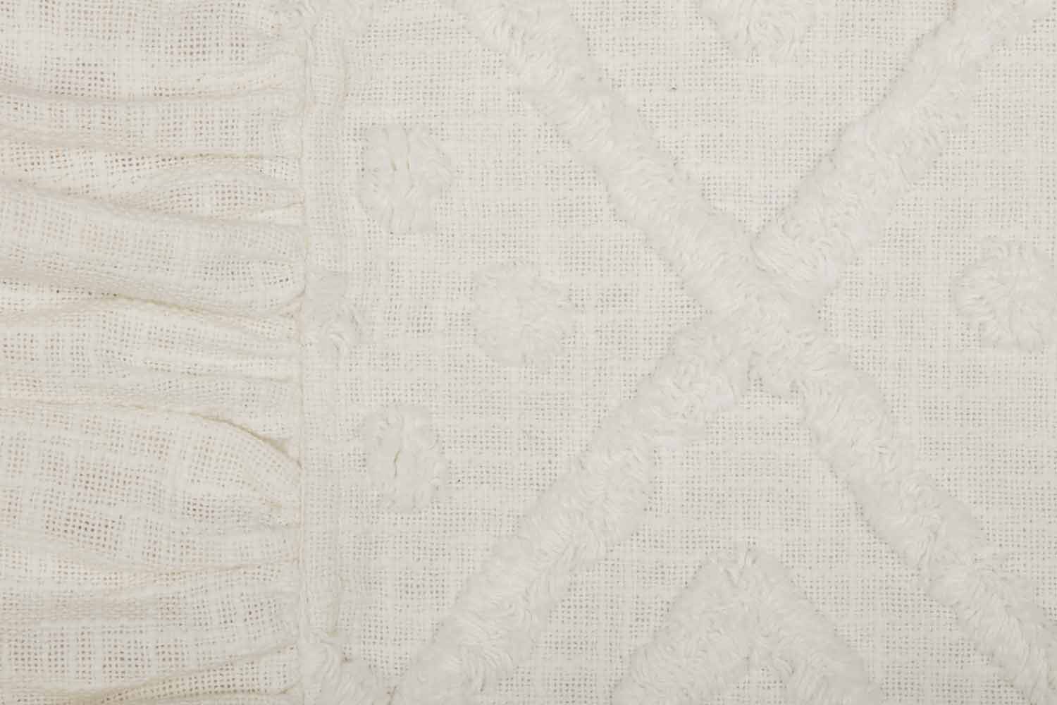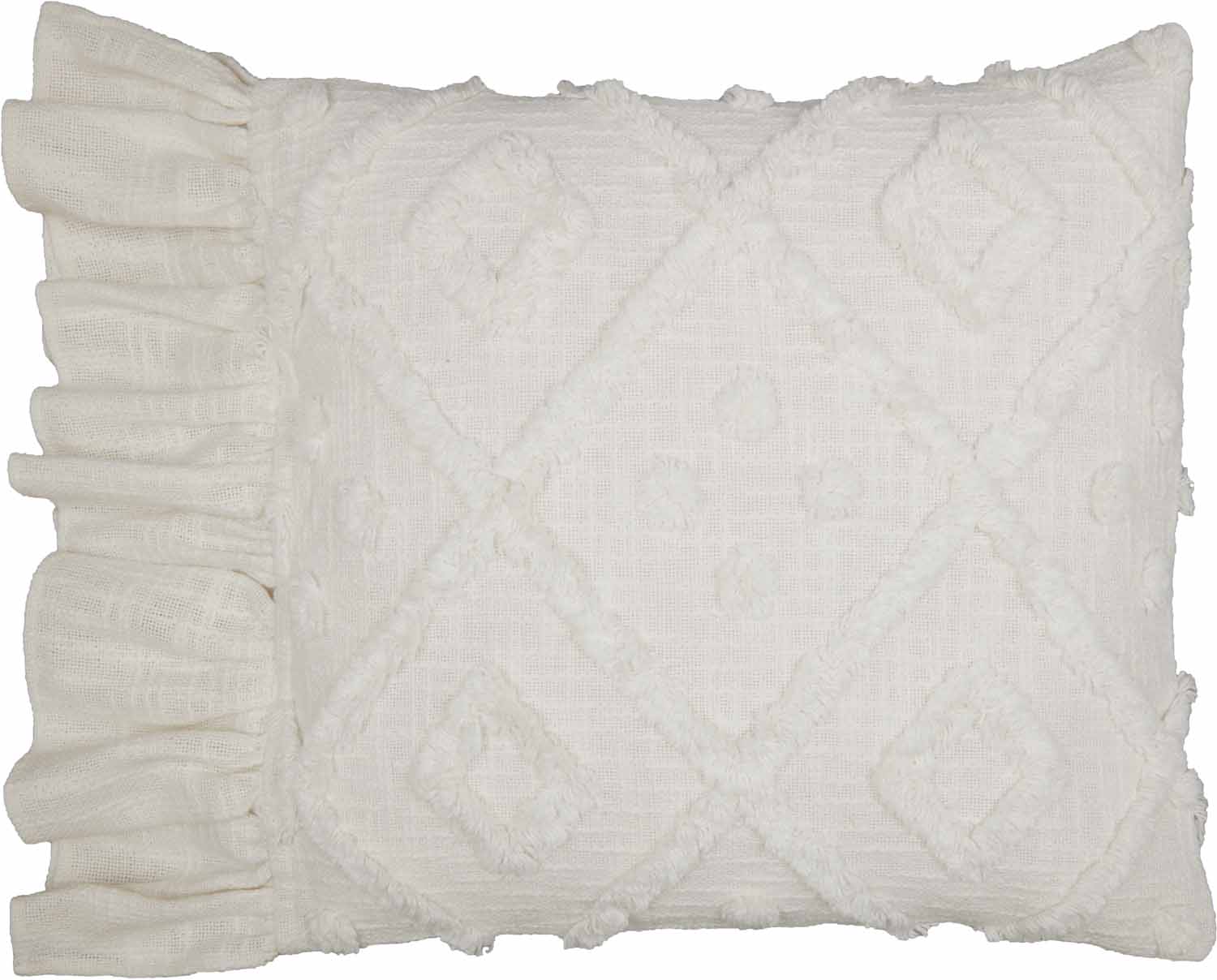 The monochromatic white has refreshing visual depth and textural interest with the shadows of the tufts and rich slubbed fabric. Large diamond shapes (8″W x 10″L) and smaller ones tucked inside are made of raised yarn. Precisely-placed tufted circles dot the inside of some large diamonds, adding more geometric style. A single-layered 5″ plain cotton ruffle graces the left side of the pillow cover, adding layers of graceful softness to your bedding. Two hidden fabric ties are tucked under the ruffle (inside) and the sham reverses to plain-textured cotton. (No tufts.)