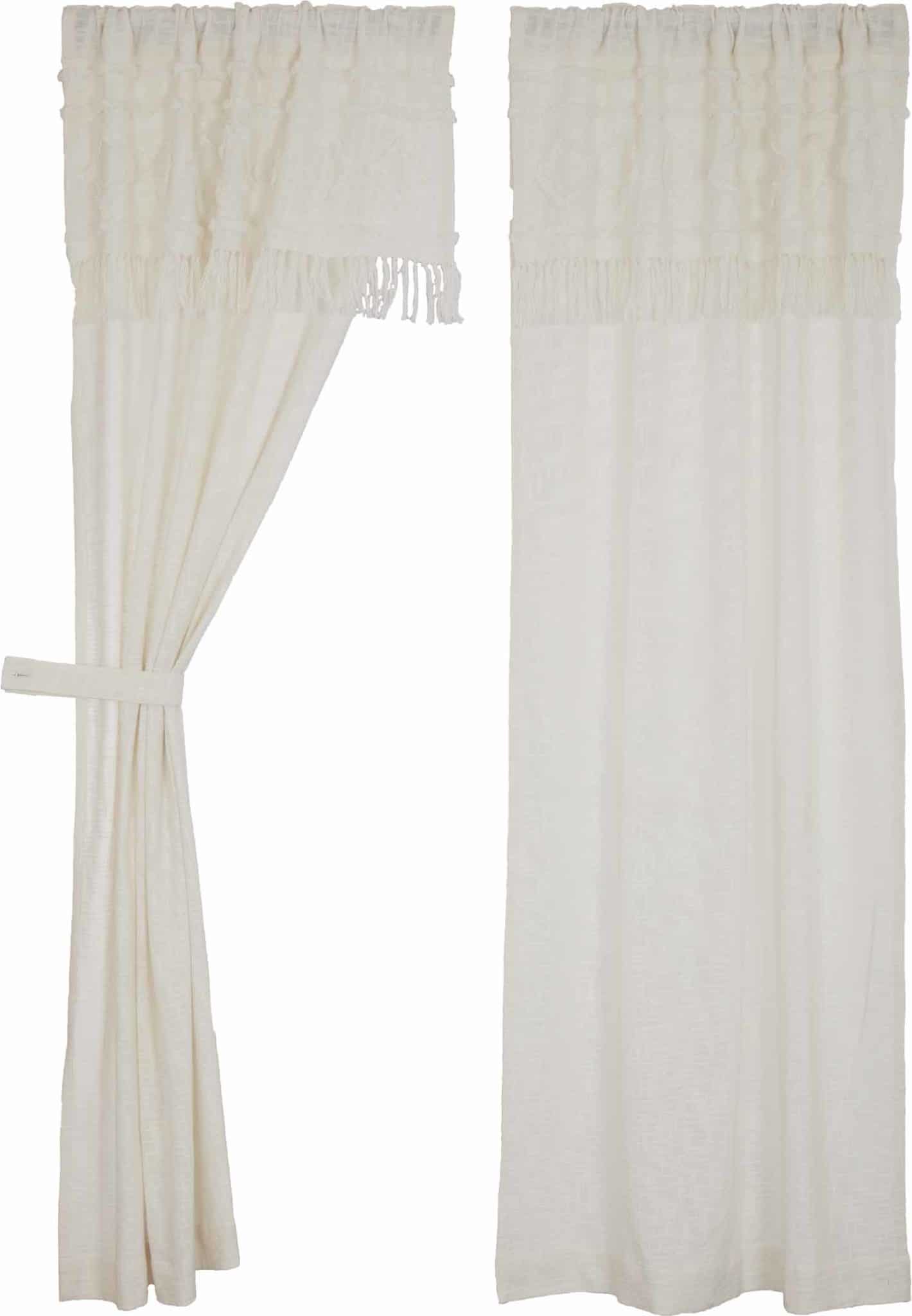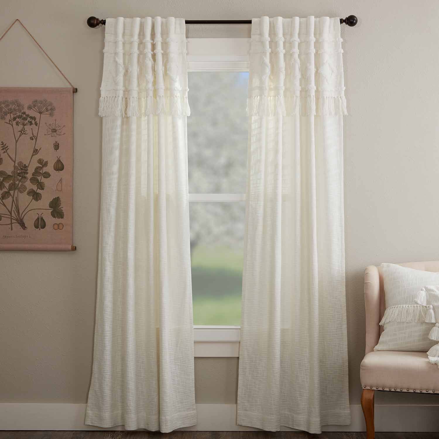 The panels are richly textured, giving them a soft, cozy hand-feel, and the overall white tones have a refreshing visual depth and textural interest with lots of shadows from the chenille and slubbed fabric. A valance accents the panels and diamonds (4.5″W & 5.75″T) created by the tufts dress up the valance. Horizontal rows of chenille frame the diamond design and knotted fringes (4″L) along the bottom edge add even more texture and a touch of whimsy. The curtain has back tabs and a rod pocket for alternate hanging options, and with no header, the top edge has a simple, understated look.