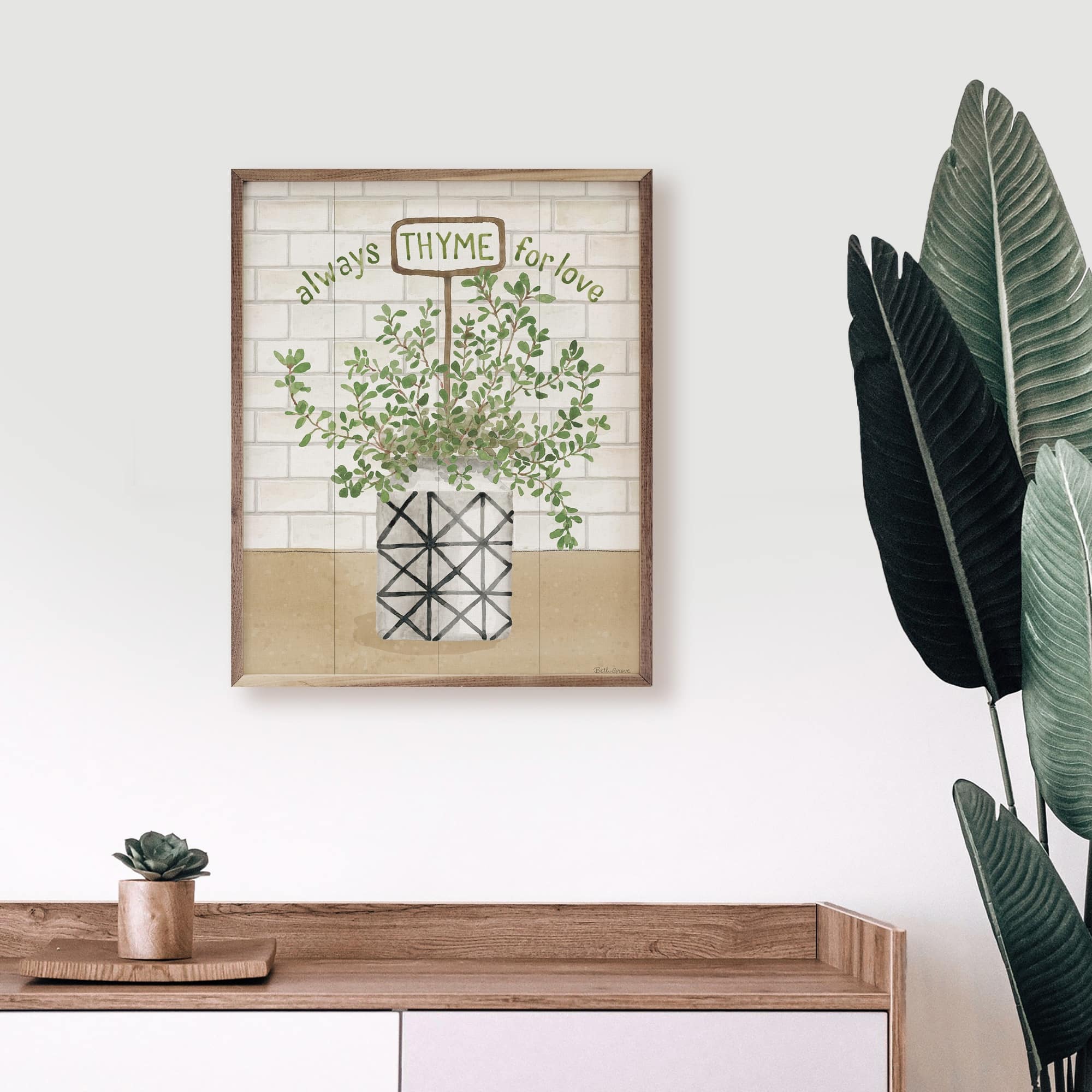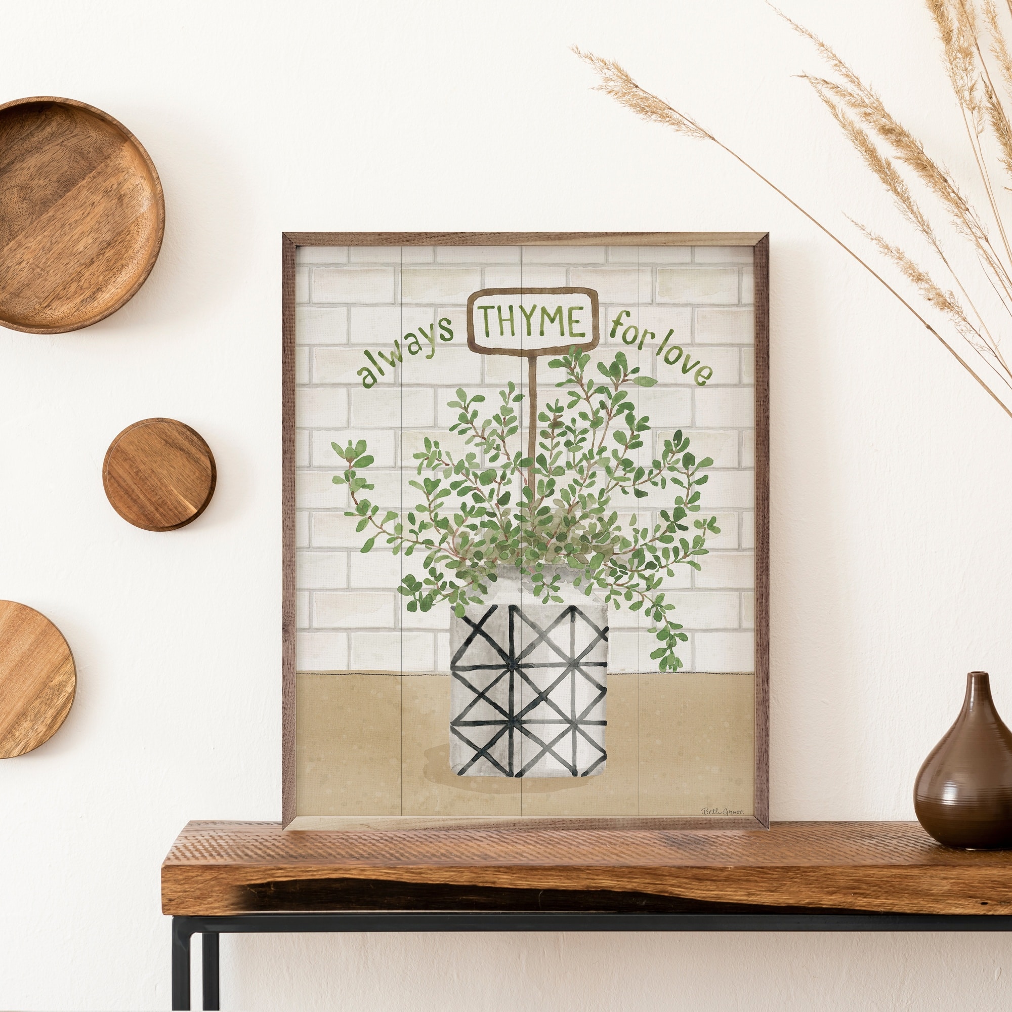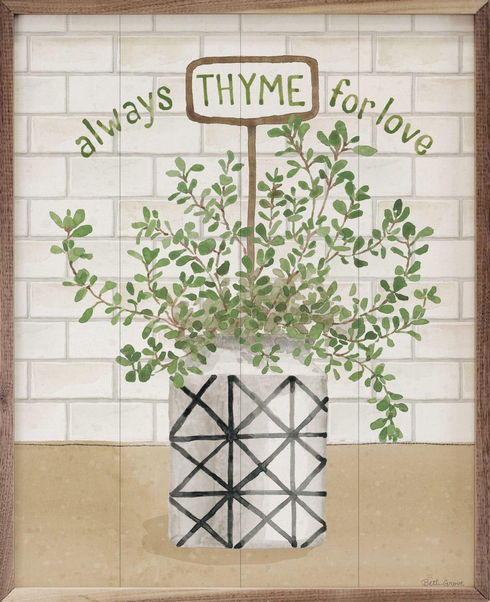 We are thrilled to be able to bring you the Herb Garden III Thyme Wooden Sign this season, with its charming, rustic style and fresh, green vitality. Darling and dainty, the simply elegant artwork of Beth Grove offers a carefully painted thyme plant, designed to capture the unique characteristics of this pretty little herb. The sign is a lovely addition to any kitchen, garden, greenhouse or herb-growing area and serves as a reminder of the beauty and diversity of gardens everywhere. Whether you’re an experienced gardener or just a novice, this sign inspires and encourages you to explore the endless possibilities of cooking and herbal medicine. Hang this delightful wooden sign in your home to add a touch of rustic charm and a dash of herbal inspiration. The wooden box frame lends a natural touch that compliments the sign, finishing the look with easy-going style that blends seamlessly with every decor.