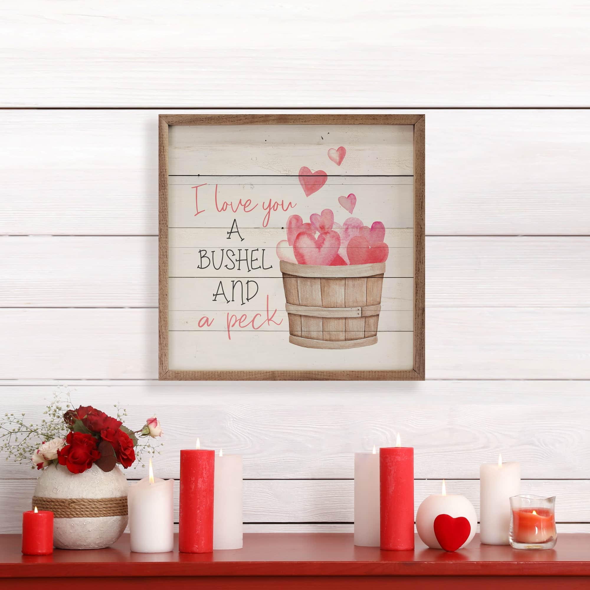 The soft tones and delightful expression bring a sweet addition to your Valentine’s Day decorating creations this year. A bushel basket flows over with warm pink, red and white hearts and the darling saying, I Love You a Bushel and A Peck, rounds out the design perfectly. The sign offers the natural element of wood with the appearance of aged barn boards, creating a charming look whether you hang the accent on a wall or door, or display in on a tabletop with a small easel. The walnut frame adds natural warmth and dimension that compliments the soft tones beautifully.