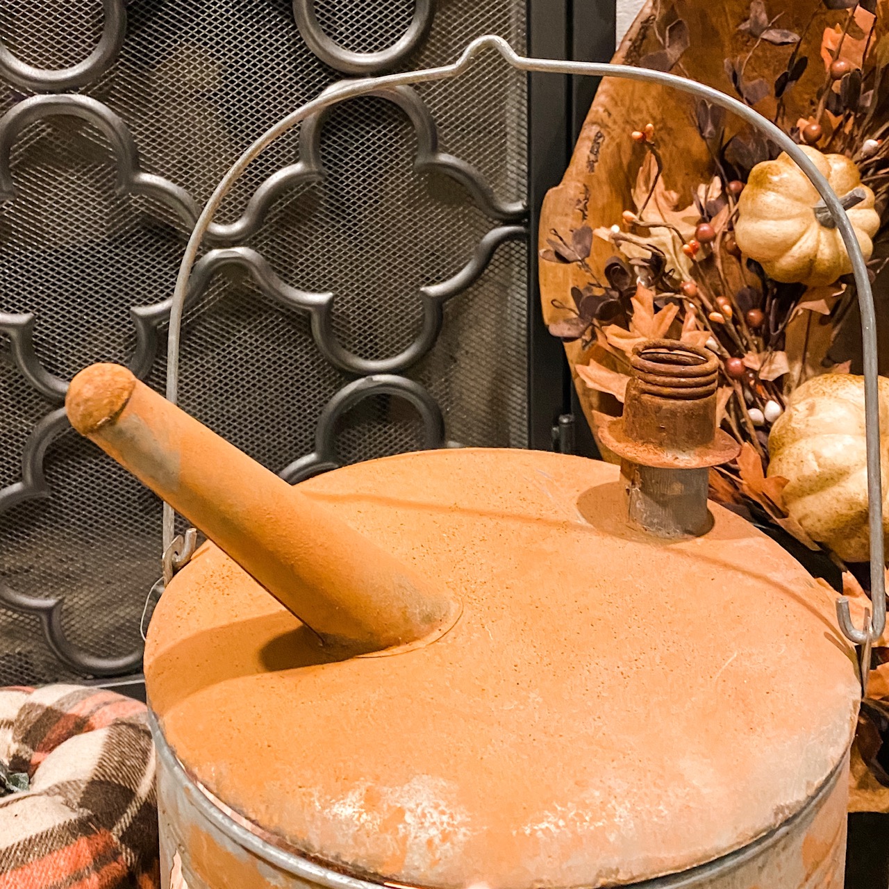 Old metal cans are very popular right now in vintage farmhouse decor, adding a big dose of history and yesteryear to everyday homes. When we spotted the weathered Jack O’ Lantern Gas Can with his crazy big smile and happy eyes, we knew that he would bring the right touch of industrial charm and rugged good looks to your seasonal displays. This accent, with its understated, rustic style offers soft, neutral tones that complement existing fall decor perfectly. Use a battery candle in this for a natural glow. (Real candle is NOT recommended.)
