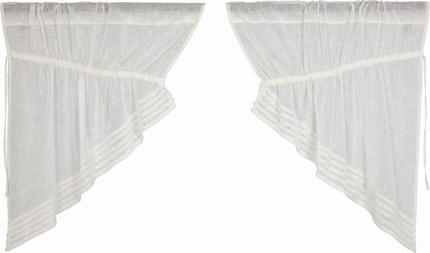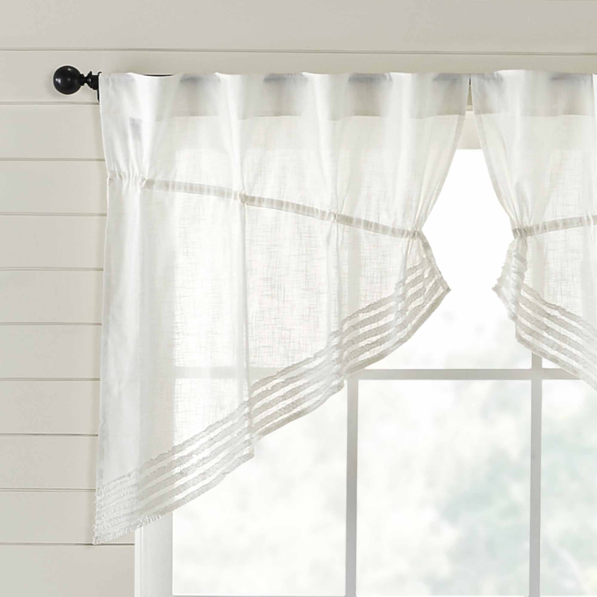 The Kathryn Prairie Swags (set/2) offer the very best in farmhouse fabrics right now. Five rows of perfectly gathered micro ruffles are finely-stitched along the bottom edge, dressing up the curtain with a rich texture and feminine flair. The unlined panels have a concealed string strap sewn into each panel at an angle so that you can create the gathered/shirred look you desire. The curtain has no header and offers dual hanging options. Comfortable, familiar fabric with lush ruffles create a gentle, stylish upgrade, combining easy-going style with casual luxury. Set/2.