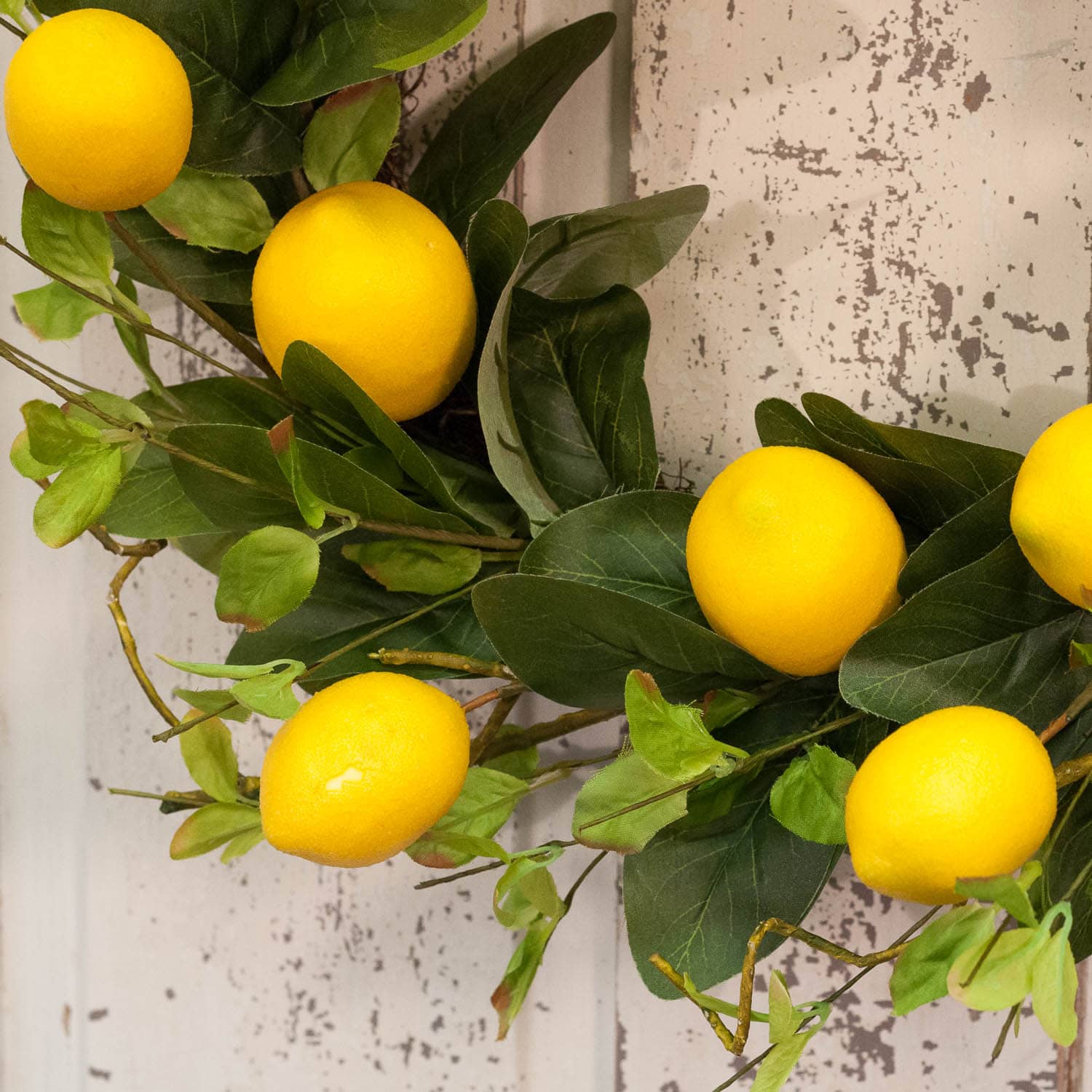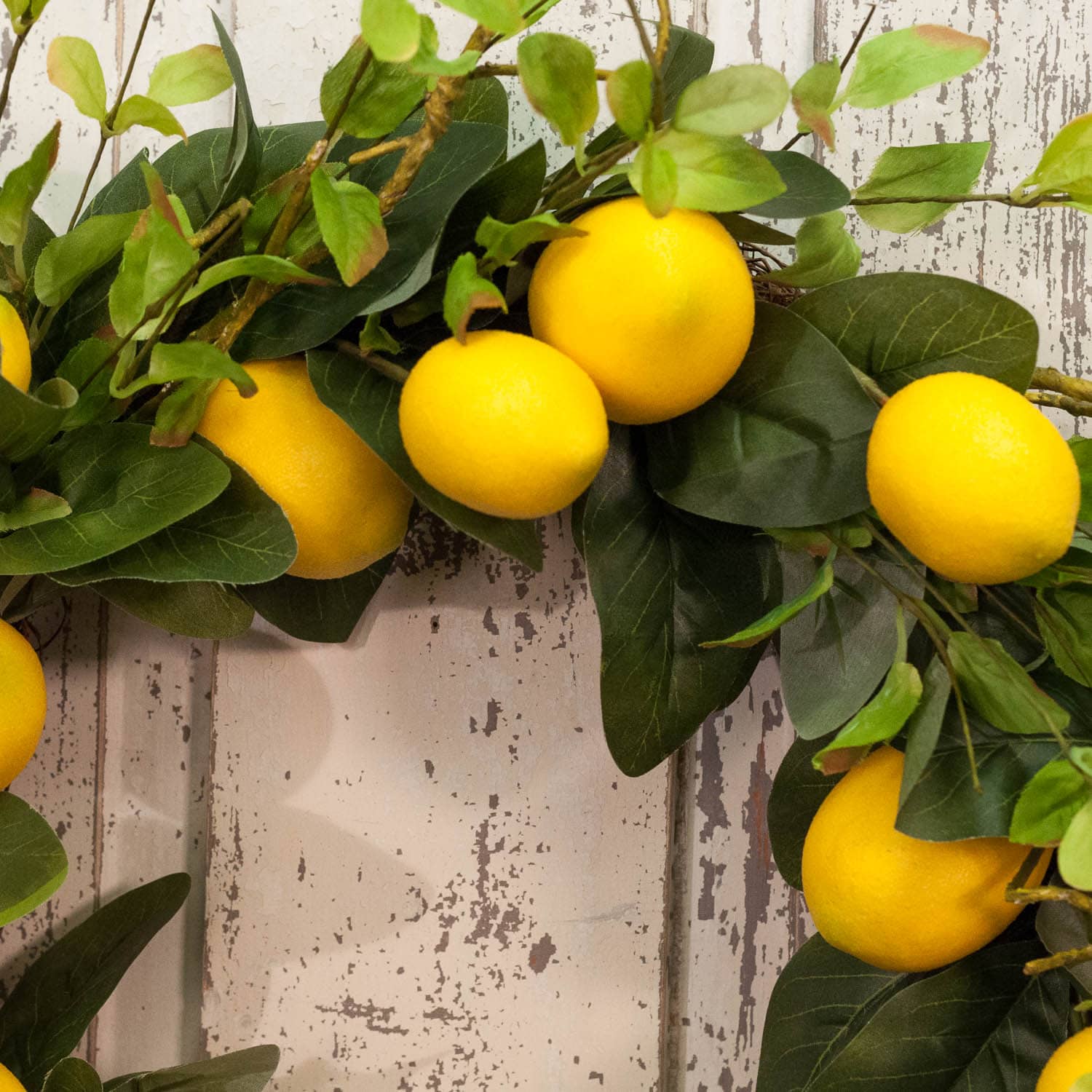 *Whenever you get a wreath home, be sure to “fluff” it to create the best possible look. Move the lemons and leaves around till it looks as realistic and attractive as possible. Since the decor is attached securely, you can adjust and bend it easily and without damaging the wreath.*