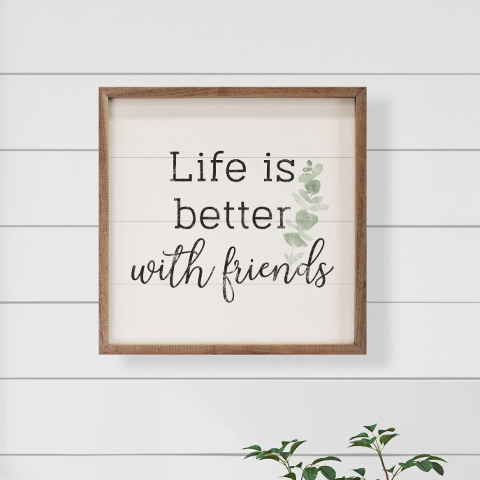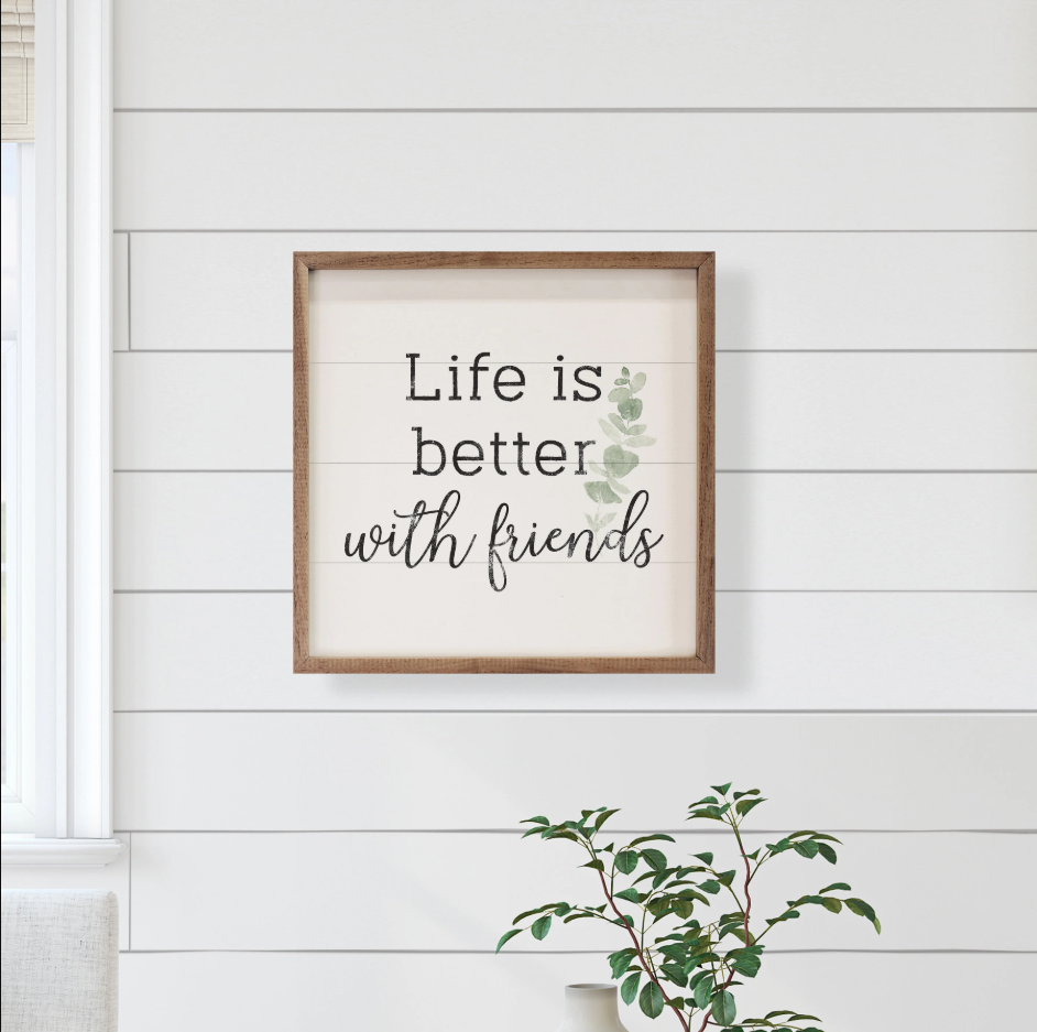 Bring warmth and positivity to your space with this charming white wooden sign featuring the heartfelt phrase “Life is Better with Friends.” Elegant black script is paired with soft watercolor-style greenery, adding a gentle touch of nature to the clean white background. Framed in natural wood, this sign blends beautifully with farmhouse, cottage, or modern rustic decor. It’s a lovely reminder of the joy found in connection, perfect for a living room, entryway, or anywhere friends are welcome. Signs are made to order.