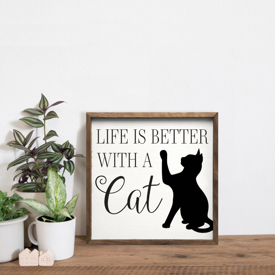 Celebrate the joy of feline companionship with this charming white wooden sign that reads, “Life is better with a Cat.” The sentiment is written in a mix of graceful script and clean block lettering, striking a perfect balance of whimsy and warmth. A sleek black silhouette of a cat sits beside the phrase, posed on its haunches with one paw lifted playfully, capturing that classic curious-cat attitude. Framed in natural wood for a cozy, rustic finish, this sign is a heartwarming addition to any cat lover’s home. Signs are made to order.